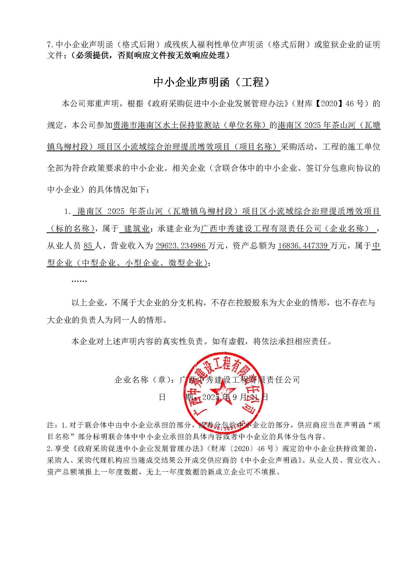 2.废标结果: 四、主要标的信息 工程类主要标的信息: 序号 | 标项名称 | 标的名称 | 施工范围 | 施工工期 | 项目经理 | 执业证书信息 | 1 | 港南区2025年茶山河(瓦塘镇乌柳村段)项目区小流域综合治理提质增效项目 | 港南区2025年茶山河(瓦塘镇乌柳村段)项目区小流域综合治理提质增效项目 | 封育治理面积1108.43h㎡,设封育治理标志碑4座,封育治理宣传牌8块,河道治理长度1900m,河道综合整治共设生态挡墙护岸2476.6m,设2处生活码头,3处排水管涵,设透水砖休闲区域810㎡,绿化带542m,太阳能路灯38套,景观石桌石凳6套,垃圾分类6处,种植乔木554棵,灌木2170株,草种4835㎡等;具体详见图纸、工程量清单及招标控制价。 | 工期为100日历天 | 谢剑武 | 注册编号:桂245181900546;注册专业、等级:水利水电工程、贰级 | 五、评审专家(单一来源采购人员)名单: 梁金萍(第1分标采购人代表),彭伟春,邓小明 六、代理服务收费标准及金额: 1.代理服务收费标准:根据发改价格〔2015〕299号文,按固定金额收费标准。 2.代理服务收费金额(元):26217 七、公告期限 自本公告发布之日起1个工作日。 八、其他补充事宜 成交供应商评审总得分:89分 九、对本次公告内容提出询问,请按以下方式联系 1.采购人信息 名 称:贵港市港南区水土保持监测站 地 址:贵港市港南区 联系方式:0775-4329572 2.采购代理机构信息 名 称:云之龙咨询集团有限公司 地 址:广西贵港市港北区荷城路1132号华泰官邸1栋6楼 联系方式:0775-4565100、4569690 3.项目联系方式 项目联系人:甘建程、廖喜平 电 话:0775-4565100、4569690 附件信息: |