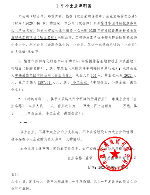 公告概要:公告信息: | 采购项目名称 | 采购2025年苗圃储备基地种植土回填整地工程项目 | 品目 | | 采购单位 | 榆林市园林绿化服务中心 | 行政区域 | 榆林市 | 公告时间 | 2025年09月22日 17:32 | 评审专家(单一来源采购人员)名单 | 刘开宇,刘美丽,尚凤羽 | 总成交金额 | ¥64.450000 万元(人民币) | 联系人及联系方式: | 项目联系人 | 张老师 | 项目联系电话 | 17709120240 | 采购单位 | 榆林市园林绿化服务中心 | 采购单位地址 | 榆林市榆阳区青山西路27号 | 采购单位联系方式 | 09123643599 | 代理机构名称 | 陕西众信玖鼎项目管理有限责任公司 | 代理机构地址 | 榆林市通达路高科城A座7楼东户3室 | 代理机构联系方式 | 17709120240 | 附件: | 附件1 | 中小企业声明.png | 附件2 | 榆林市园林绿化服务中心采购2025年苗圃储备基地种植土回填整地工程项目中标(成交)明细.pdf | 附件3 | 竞争性谈判文件.pdf |