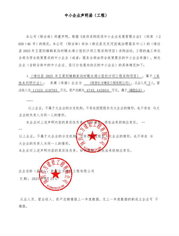 四、主要标的信息合同包1(靖边县2025年王渠则镇韩家沟村暖水湾小型拦沙坝工程采购项目): 工程类(陕西长方建设工程有限公司)