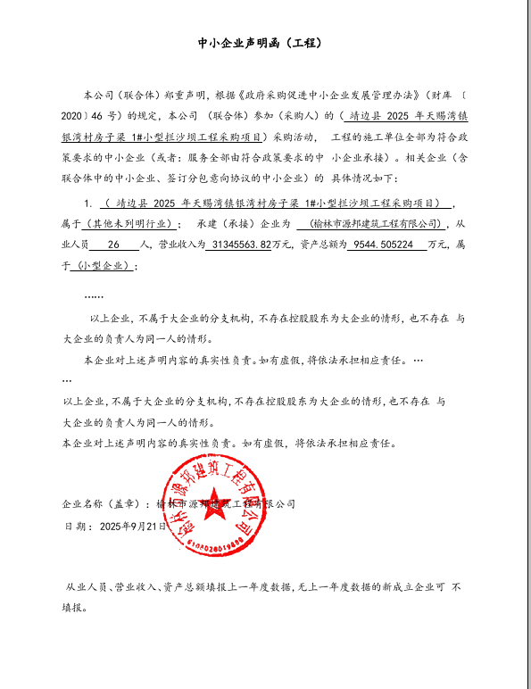 四、主要标的信息合同包1(靖边县2025年天赐湾镇银湾村房子梁1#小型拦沙坝工程采购项目): 工程类(榆林市源邦建筑工程有限公司)