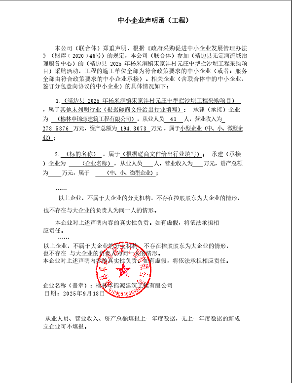 四、主要标的信息合同包1(靖边县2025年杨米涧镇宋家洼村元庄中型拦沙坝工程采购项目): 工程类(榆林卓锦源建筑工程有限公司)