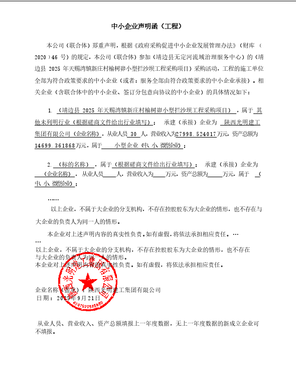 四、主要标的信息合同包1(靖边县2025年天赐湾镇新庄村榆树峁小型拦沙坝工程采购项目): 工程类(陕西光明建工集团有限公司)