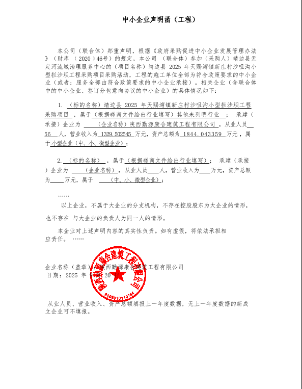 四、主要标的信息合同包1(靖边县2025年天赐湾镇新庄村沙咀沟小型拦沙坝工程采购项目): 工程类(陕西勤源康合建筑工程有限公司)