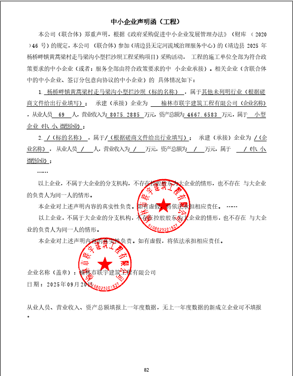 四、主要标的信息合同包1(靖边县2025年杨桥畔镇黄蒿梁村走马梁沟小型拦沙坝工程采购项目): 工程类(榆林市联宇建筑工程有限公司)