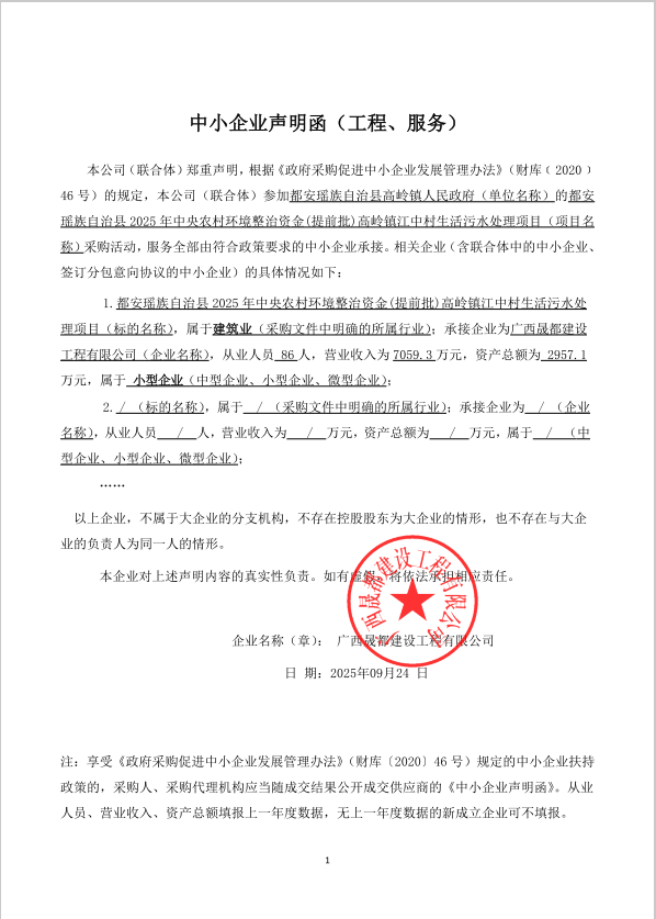 2.废标结果: 四、主要标的信息 工程类主要标的信息: 序号 | 标项名称 | 标的名称 | 施工范围 | 施工工期 | 项目经理 | 执业证书信息 | 1 | 都安瑶族自治县2025年中央农村环境整治资金(提前批)高岭镇江中村生活污水处理项目 | 都安瑶族自治县2025年中央农村环境整治资金(提前批)高岭镇江中村生活污水处理项目 | 本项目主要建设内容包括:项目位于河池市都安县内,共涉及1个行政村,3个自然屯,建设农村相对集中式污水处理站4座,处理总方数为120m³/d。主要施工内容包括:新建市政给排水管网、污水处理站、围墙、绿化等。详见工程量清单和图纸。 | 自合同签订之日起至90天内完成。 | 李超 | 桂245151654813 | 五、评审专家(单一来源采购人员)名单: 陈文胜,韦拯(第1分标采购人代表),杨智 六、代理服务收费标准及金额: 1.代理服务收费标准:参照原国家发展计划委员会计价格[2002]1980号《招标代理服务费管理暂行办法》收费标准(工程类)及发改价格[2011]534号文的规定收取。 2.代理服务收费金额(元):34334 七、公告期限 自本公告发布之日起1个工作日。 八、其他补充事宜 1、公告媒体:中国政府采购网(www.ccgp.gov.cn)、广西政府采购网(zfcg.gxzf.gov.cn)、全国公共资源交易平台(广西•都安)(http://ggzy.jgswj.gxzf.gov.cn/daxggzy/)、都安瑶族自治县人民政府网(http://www.duan.gov.cn) 2、成交供应商的评审总得分:93.33分。 九、对本次公告内容提出询问,请按以下方式联系 1.采购人信息 名 称:都安瑶族自治县高岭镇人民政府 地 址:广西河池市都安县高岭镇高岭街城中路12号 联系方式:0778-5311128 2.采购代理机构信息 名 称:广西科文招标有限公司 地 址:广西河池市金城江区文苑路34号国土小区3号楼302号 联系方式:0778-2283078 3.项目联系方式 项目联系人:李阳 电 话:0778-2283078 附件信息: |