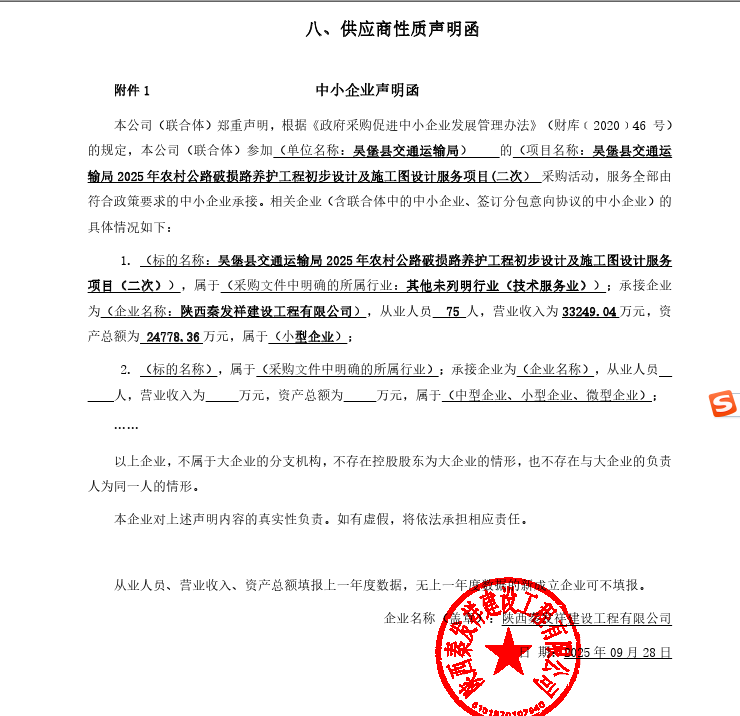 一、项目编号:HXXS2025-015 二、项目名称:2025年农村公路破损路养护工程初步设计及施工图设计服务项目(二次) 三、采购结果 采购包1: 供应商名称 | 供应商地址 | 中标(成交)金额 | 评审总得分 | 陕西秦发祥建设工程有限公司 | 陕西省西安市碑林区中贸广场15幢1单元27层12707 | 985,500.00元 | 78.67 | 四、主要标的信息 合同包1(吴堡县交通运输局2025年农村公路破损路养护工程初步设计及施工图设计服务项目): 服务类(陕西秦发祥建设工程有限公司) 品目号 | 品目名称 | 采购标的 | 服务范围 | 服务要求 | 服务时间 | 服务标准 | 金额(元) | 1 | 工程设计服务 | 吴堡县2025年农村公路破损路养护工程初步设计及施工图设计服务 | 符合磋商文件要求 | 满足采购要求 | 符合磋商文件要求 | 满足采购要求 | 985,500.00 | 五、评审专家(单一来源采购人员)名单: 六、代理服务收费标准及金额: 代理服务收费标准及金额 | 招标代理费参考《国家计委关于印发<招标代理服务收费管理暂行办法>的通知》(计价格[2002]1980号)和国家发展改革和委员会办公厅颁发的《关于招标代理服务收费有关问题的通知》(发改办价格『2003』857号)文件规定的收费标准 | 合同包号 | 合同包名称 | 代理服务费金额(万元) | 收取对象 | 1 | 吴堡县交通运输局2025年农村公路破损路养护工程初步设计及施工图设计服务项目 | 1.188 | 采购人 | 七、公告期限 自本公告发布之日起1个工作日。 八、其他补充事宜 九、凡对本次公告内容提出询问,请按以下方式联系。 1.采购人信息 名称:吴堡县交通运输局 地址:陕西省吴堡县宋家川镇新建街155号 联系方式:13109220678 2.采购代理机构信息 名称:陕西泓祥兴顺工程项目管理有限公司 地址:榆林市高新华府西门二层1号商铺 联系方式:17749200027 3.项目联系方式 项目联系人:陈浩 电话:17749200027 陕西泓祥兴顺工程项目管理有限公司 2025年10月09日 |