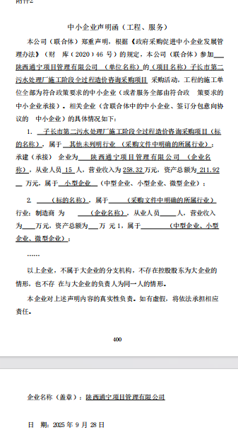 公告概要:公告信息: | 采购项目名称 | 子长市第二污水处理厂施工阶段全过程造价咨询采购项目 | 品目 | | 采购单位 | 子长市城市管理执法局 | 行政区域 | 子长县 | 公告时间 | 2025年10月09日 17:34 | 评审专家(单一来源采购人员)名单 | 武子帧,朱红,张彩霞 | 总成交金额 | ¥67.500000 万元(人民币) | 联系人及联系方式: | 项目联系人 | 赵勃勃 | 项目联系电话 | 0911-8892737 | 采购单位 | 子长市城市管理执法局 | 采购单位地址 | 子长市暖水沟旧粮站 | 采购单位联系方式 | 15332567900 | 代理机构名称 | 陕西泽信项目管理有限公司 | 代理机构地址 | 延安市新区能源小区B区7号楼一单元1301室 | 代理机构联系方式 | 0911-8892737 | 附件: | 附件1 | 子长市城市管理执法局子长市第二污水处理厂施工阶段全过程造价咨询采购项目中标(成交)明细.pdf | 附件2 | 招标文件正文[1].pdf | 附件3 | 中小企业声明函.png |