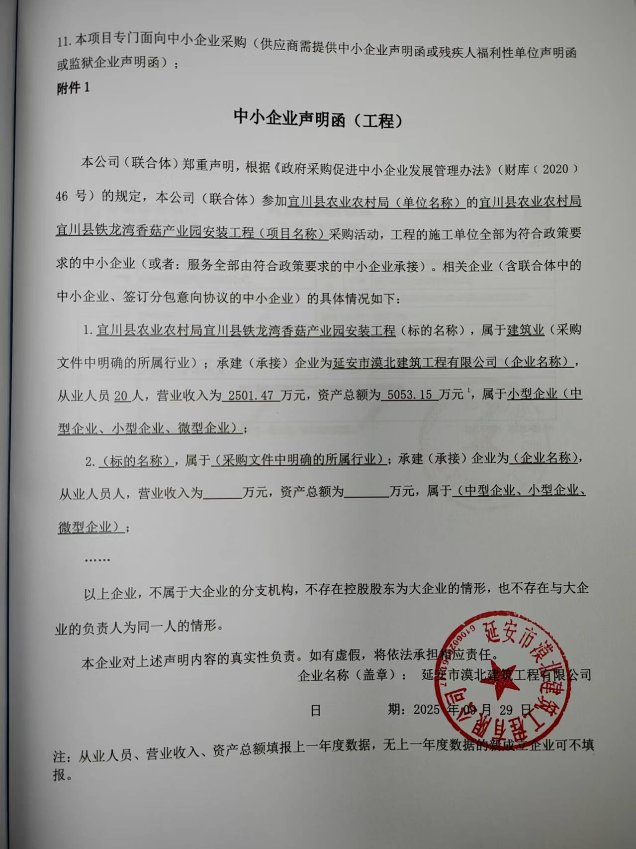 公告概要:公告信息: | 采购项目名称 | 宜川县铁龙湾香菇产业园安装工程 | 品目 | | 采购单位 | 宜川县农业农村局 | 行政区域 | 宜川县 | 公告时间 | 2025年10月09日 15:32 | 评审专家(单一来源采购人员)名单 | 张庆宇,薛梅,雷周平 | 总成交金额 | ¥298.400000 万元(人民币) | 联系人及联系方式: | 项目联系人 | 赵雪 | 项目联系电话 | 13468580710 | 采购单位 | 宜川县农业农村局 | 采购单位地址 | 宜川县政府大院 | 采购单位联系方式 | 18291123272 | 代理机构名称 | 陕西伯乐项目管理有限公司 | 代理机构地址 | 陕西省延安市宝塔区陕西省延安市宝塔区枣园路民恩首富小区院内2号楼1303室 | 代理机构联系方式 | 13468580710 | 附件: | 附件1 | 磋商文件 -2025.9.17.docx | 附件2 | 宜川县农业农村局宜川县铁龙湾香菇产业园安装工程中标(成交)明细.pdf | 附件3 | 中小企业声明函.jpg |