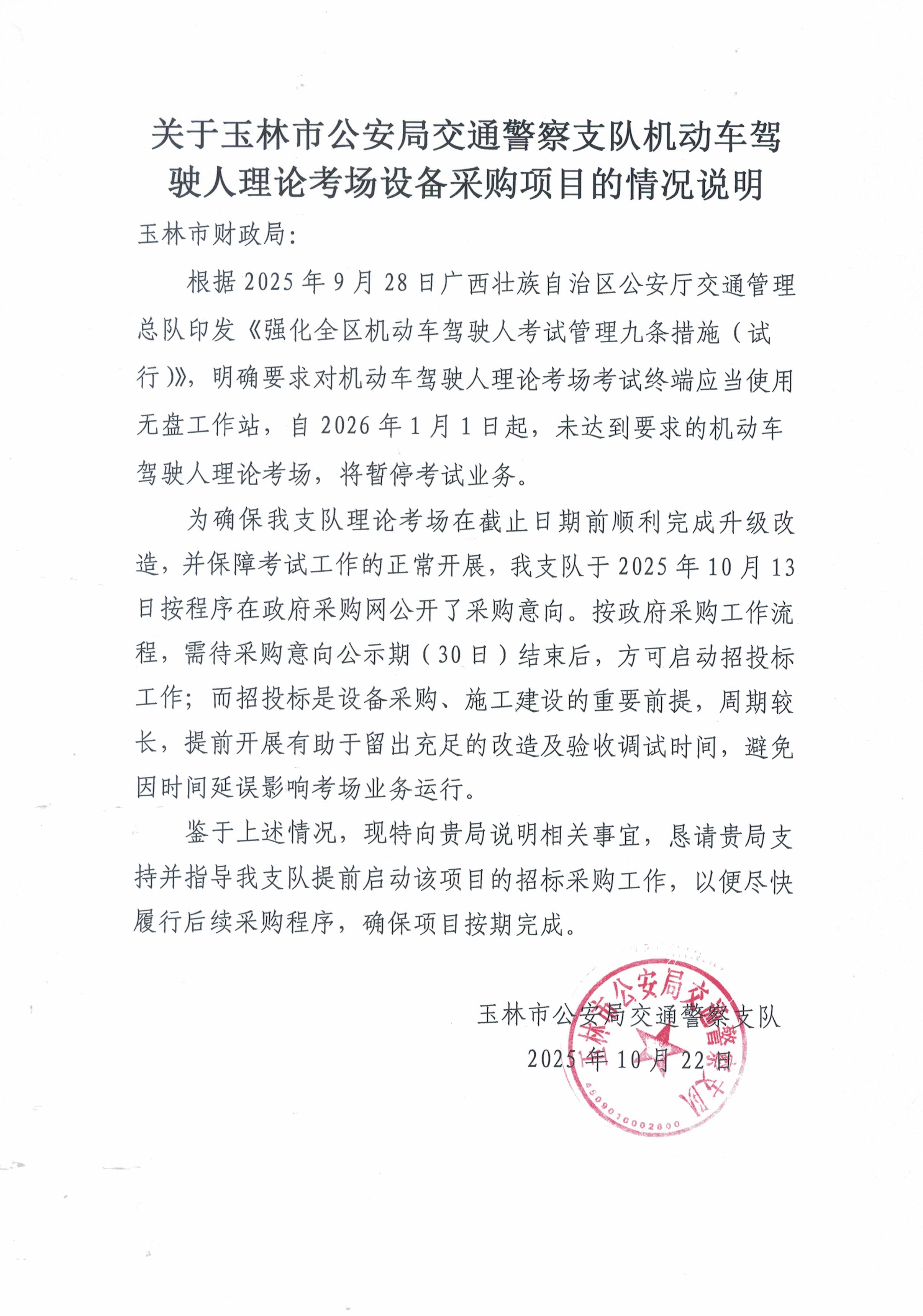 公告概要:| 公告信息: | | 采购项目名称 | 玉林市公安局交通警察支队机动车驾驶人理论考场设备采购 | | 品目 | | | 采购单位 | 玉林市公安局交通管理支队 | | 行政区域 | 广西壮族自治区 | 公告时间 | 2025年11月10日 17:34 | | 获取采购文件的地点 | 广西政府采购云平台线上获取 | | 获取采购文件时间 | 详见公告正文 | | 预算金额 | ¥108.101000万元(人民币) | | 联系人及联系方式: | | 项目联系人 | 文庆金 | | 项目联系电话 | 0775-2685857 | | 采购单位 | 玉林市公安局交通管理支队 | | 采购单位地址 | 玉林市勤政路39号 | | 采购单位联系方式 | 0775-2582966 | | 代理机构名称 | 广西科文招标有限公司 | | 代理机构地址 | 广西玉林市文体北路5号富林·双泉雅苑商住小区1幢03号商铺 | | 代理机构联系方式 | 0775-2685857 |