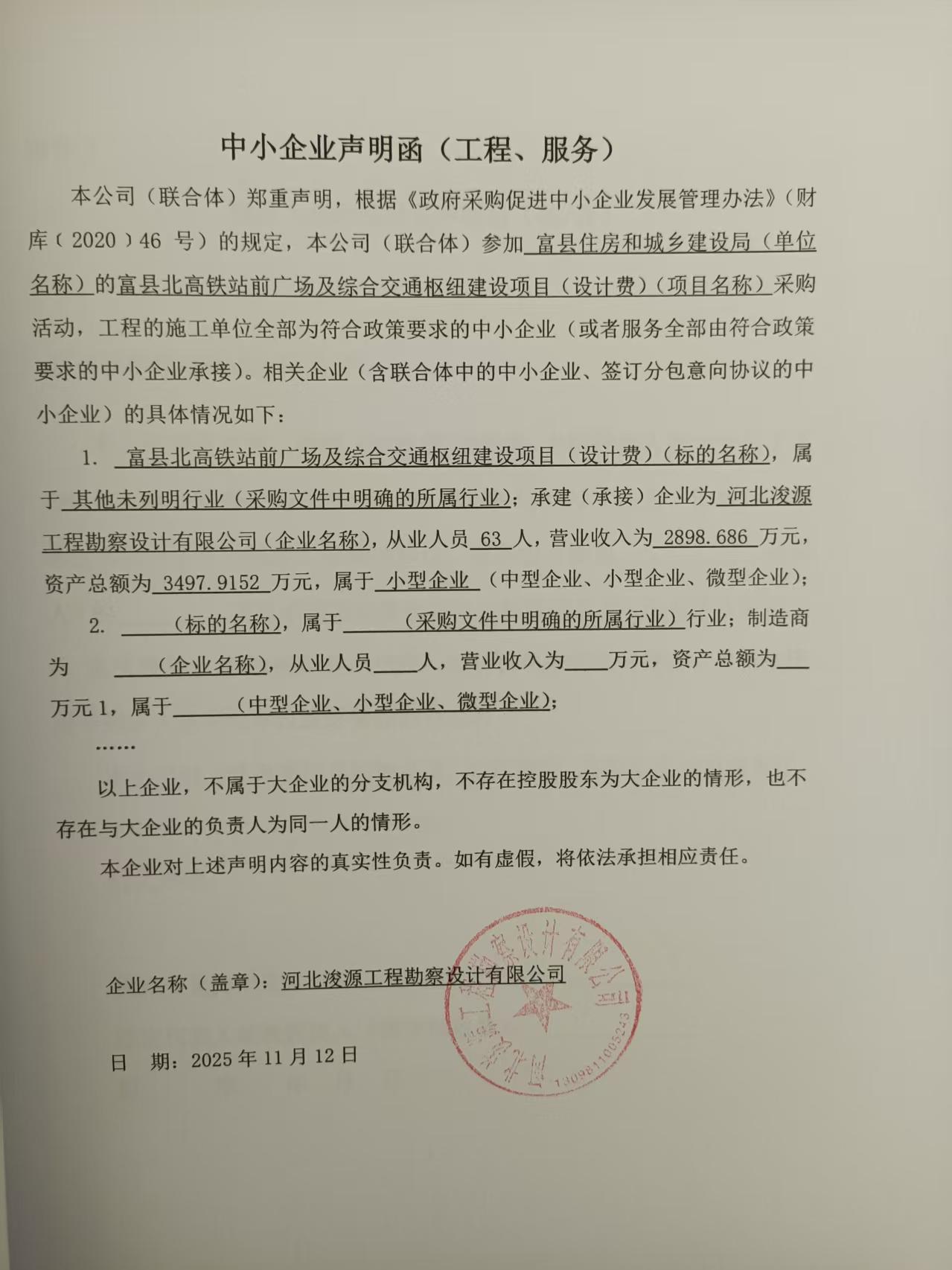 一、项目编号:ZXZC2025-028 二、项目名称:富县北高铁站前广场及综合交通枢纽建设项目(设计费) 三、采购结果 采购包1: | 供应商名称 | 供应商地址 | 中标(成交)金额 | 评审总得分 | | 河北浚源工程勘察设计有限公司 | 泊头市建设大街 | 878,000.00元 | 83.53 | 四、主要标的信息 合同包1(富县北高铁站前广场及综合交通枢纽建设项目(设计费)): 服务类(河北浚源工程勘察设计有限公司) | 品目号 | 品目名称 | 采购标的 | 服务范围 | 服务要求 | 服务时间 | 服务标准 | 金额(元) | | 1 | 工程设计服务 | 富县北高铁站前广场及综合交通枢纽建设项目(设计费) | 详见采购文件 | 详见采购文件 | 30天 | 合格 | 878,000.00 | 五、评审专家(单一来源采购人员)名单: 六、代理服务收费标准及金额: | 代理服务收费标准及金额 | 照国家计委关于印发《招标代理服务收费管理暂行办法》计价格[2002]1980号文和《国家发展改革委关于降低部分建设项目收费标准规范收费行为等有关问题的通知》发改价格[2011]534号规定标准收取 | | 合同包号 | 合同包名称 | 代理服务费金额(万元) | 收取对象 | | 1 | 富县北高铁站前广场及综合交通枢纽建设项目(设计费) | 1.3169 | 中标(成交)供应商 | 七、公告期限 自本公告发布之日起1个工作日。 八、其他补充事宜 九、凡对本次公告内容提出询问,请按以下方式联系。 1.采购人信息 名称:富县住房和城乡建设局 地址:富县北教场开元小区综合服务楼 联系方式:13891138208 2.采购代理机构信息 名称:陕西泽信项目管理有限公司 地址:延安市新区能源小区B区7号楼一单元1301室 联系方式:0911-8892737 3.项目联系方式 项目联系人:赵勃勃 电话:0911-8892737 陕西泽信项目管理有限公司 2025年11月18日 |
