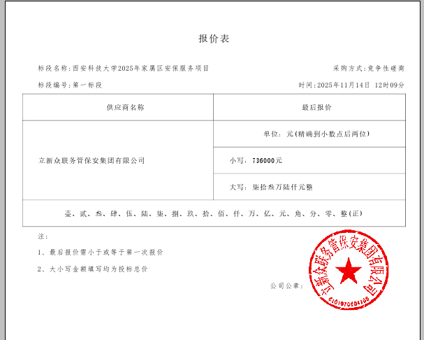七、公告期限自本公告发布之日起1个工作日。 八、其他补充事宜根据财办库〔2023〕243号《关于进一步提高政府采购透明度和采购效率相关事项的通知》公示如下:立新众联务管保安集团有限公司 评审总得分:227.00分;评审平均分:75.67分;最终得分:93.84分。 九、凡对本次公告内容提出询问,请按以下方式联系。1.采购人信息名称:西安科技大学 地址:西安市雁塔路58号 联系方式:13609243561 2.采购代理机构信息名称:陕西省省级单位政府采购中心 地址:西安市碑林区长安北路14号 联系方式:029-88661306 3.项目联系方式项目联系人:吴老师 电话:029-88661306 陕西省省级单位政府采购中心 2025年11月20日 相关公告 | ||||||||||||||||||||||||||||||||||||||||||||||||||||||||||||||||||||||||||||||||||||||||||||||||||||||||||||||||||||||||||||||||