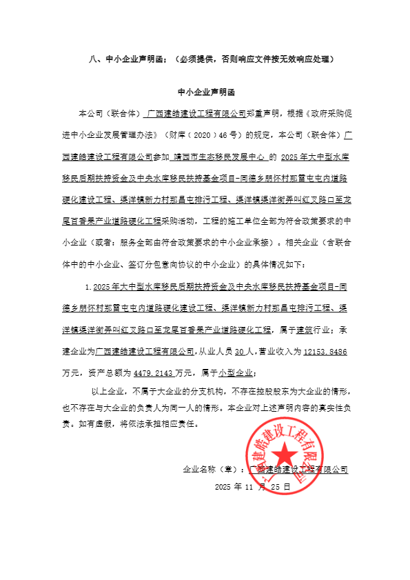 2.废标结果: 四、主要标的信息 工程类主要标的信息: | 序号 | 标项名称 | 标的名称 | 施工范围 | 施工工期 | 项目经理 | 执业证书信息 | | 1 | 2025年大中型水库移民后期扶持资金及中央水库移民扶持基金项目-同德乡朋怀村那雷屯屯内道路硬化建设工程、渠洋镇新力村那昌屯排污工程、渠洋镇渠洋街弄叫红叉路口至龙尾百香果产业道路硬化工程 | 2025年大中型水库移民后期扶持资金及中央水库移民扶持基金项目-同德乡朋怀村那雷屯屯内道路硬化建设工程、渠洋镇新力村那昌屯排污工程、渠洋镇渠洋街弄叫红叉路口至龙尾百香果产业道路硬化工程 | 2025年大中型水库移民后期扶持资金及中央水库移民扶持基金项目-同德乡朋怀村那雷屯屯内道路硬化建设工程、渠洋镇新力村那昌屯排污工程、渠洋镇渠洋街弄叫红叉路口至龙尾百香果产业道路硬化工程,主要建设内容:1.同德乡朋怀村那雷屯屯内道路硬化建设工程:新建场地硬化2056.50㎡,拆除旧路面1720㎡;2.渠洋镇新力村那昌屯排污工程:新增污水收集管道、污水处理设施;3.渠洋镇渠洋街弄叫红叉路口至龙尾百香果 | 90日历天 | 刘德远 | 桂245151900105 | 五、评审专家(单一来源采购人员)名单: 陈祥娇,丁伟堂,黄海燕(第1分标采购人代表) 六、代理服务收费标准及金额: 1.代理服务收费标准:根据《国家发展改革委关于进一步放开建设项目专业服务价格的通知》(发改价格〔2015〕299号)要求,按市场价计算执行:(100万以内(包括100万)部分,按成交金额的1%计取,100万到500万(包括500万)部分按成交金额的0.7%计取)标准收取,由成交人在领取成交通知书时以现金或转账方式一次性向采购代理机构支付 2.代理服务收费金额(元):9144 七、公告期限 自本公告发布之日起1个工作日。 八、其他补充事宜 1、成交供应商的评审总得分:80.33分。 2、供应商认为成交结果使自己的权益受到损害的,可以在成交结果公告期限届满之日起七个工作日内以书面形式向采购人或受托代理机构提出质疑,逾期将不再受理。 3、公告媒体:中国政府采购网(http://www.ccgp.gov.cn)、广西壮族自治区政府采购网(http://zfcg.gxzf.gov.cn/)。 九、对本次公告内容提出询问,请按以下方式联系 1.采购人信息 名 称:靖西市生态移民发展中心 地 址:靖西市新靖镇幸福大道政务中心8楼 联系方式:0776-6212224 2.采购代理机构信息 名 称:广西万丰项目管理有限公司 地 址:靖西市云天城A6栋1012号 联系方式:0776-6120050 3.项目联系方式 项目联系人:邓凤蓉 电 话:0776-6120050 附件信息: |