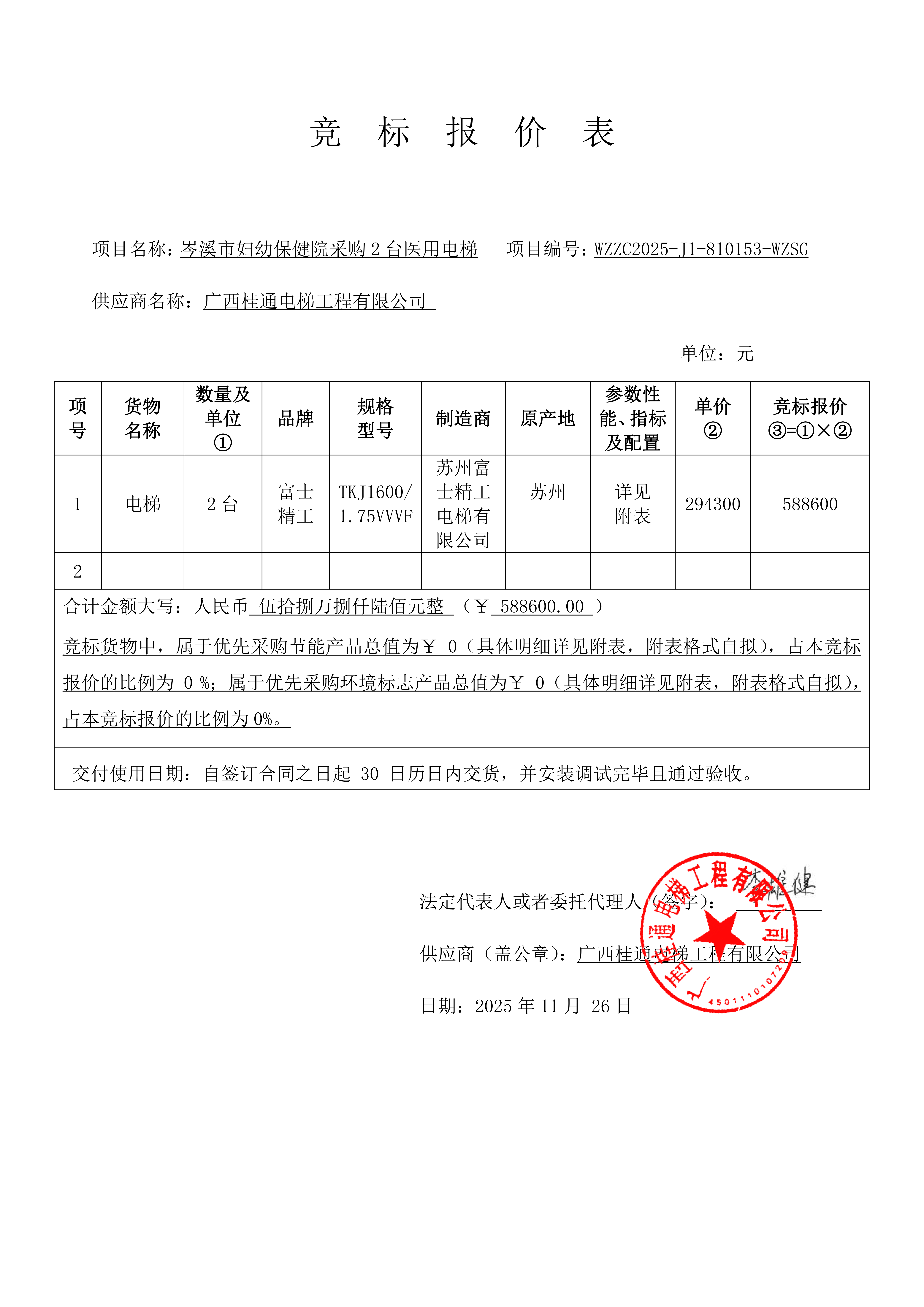 一、项目编号:WZZC2025-J1-810153-WZSG 二、项目名称:岑溪市妇幼保健院采购2台医用电梯 三、中标(成交)信息 1.中标结果: | 序号 | 中标(成交)金额(元) | 中标供应商名称 | 中标供应商地址 | | 1 | 报价:588600(元) | 广西桂通电梯工程有限公司 | 南宁市高新二路107号龙庭郡都1栋2单元1903号房 |
