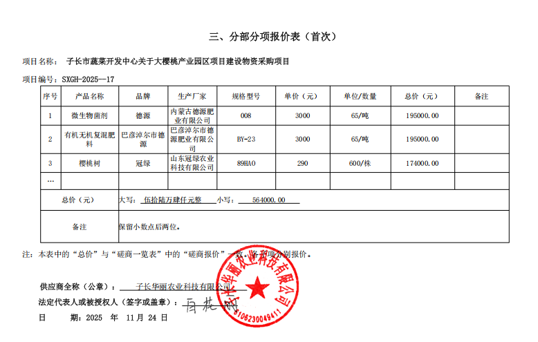 一、项目编号:SXGH-2025--17 二、项目名称:关于大樱桃产业园区项目建设物资采购项目 三、采购结果 采购包1: | 供应商名称 | 供应商地址 | 中标(成交)金额 | 评审总得分 | | 子长华丽农业科技有限公司 | 陕西省延安市子长市秀延街道办薛家沟移民新村 | 560,750.00元 | 96.00 | 四、主要标的信息 合同包1(子长市蔬菜开发中心关于大樱桃产业园区项目建设物资采购项目): 货物类(子长华丽农业科技有限公司) | 品目号 | 品目名称 | 采购标的 | 品牌 | 规格型号 | 数量(单位) | 单价(元) | 总价(元) | | 1 | 化学肥料 | 大樱桃产业园区项目建设物资采购 | 详见附件 | 详见附件 | 1.00(批) | 560,750.00 | 560,750.00 | 五、评审专家(单一来源采购人员)名单: 六、代理服务收费标准及金额: | 代理服务收费标准及金额 | 参照《国家计委关于印发招标代理服务收费管理暂行办法的通知》(计价格【2002】1980号)和国家发改委办公厅颁发的《关于招标代理服务收费有关问题的通知》(发改办价格【2003】857号)收取。 | | 合同包号 | 合同包名称 | 代理服务费金额(万元) | 收取对象 | | 1 | 子长市蔬菜开发中心关于大樱桃产业园区项目建设物资采购项目 | 0.8411 | 中标(成交)供应商 | 七、公告期限 自本公告发布之日起1个工作日。 八、其他补充事宜 九、凡对本次公告内容提出询问,请按以下方式联系。 1.采购人信息 名称:子长市蔬菜开发中心 地址:陕西省延安市子长县东关农科院5楼1号 联系方式:13991788996 2.采购代理机构信息 名称:陕西共航项目管理有限公司 地址:延安市宝塔区新城街道上城六号二号楼一单元801室 联系方式:19929819394 3.项目联系方式 项目联系人:杨银萍 电话:19929819394 陕西共航项目管理有限公司 2025年12月01日 |