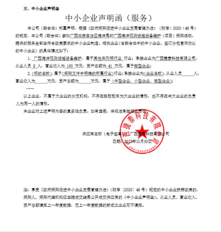 一、项目编号:GXZC2025-C3-003465-SHZH 二、项目名称:广西海洋观测设施设备维护 三、中标(成交)信息 1.中标结果: | 序号 | 中标(成交)金额(元) | 中标供应商名称 | 中标供应商地址 | | 1 | 报价:1278000(元) | 广西捷泰科技有限公司 | 南宁市青秀区厢竹大道7号天立·东方大厦A座2502号 |