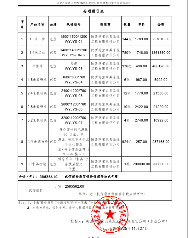四、主要标的信息合同包1(西安外国语大学2025年长安校区教学楼教研室工位采购项目): 货物类(陕西范玺家具系统工程有限责任公司)
