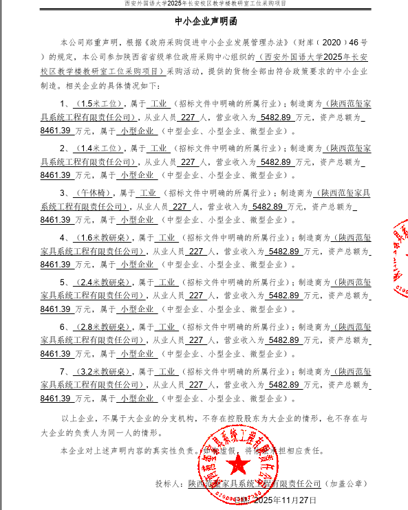 七、公告期限自本公告发布之日起1个工作日。 八、其他补充事宜根据财办库〔2023〕243号《关于进一步提高政府采购透明度和采购效率相关事项的通知》公示如下:陕西范玺家具系统工程有限责任公司 评审总得分:338.00分;评审平均分:67.60分;最终得分87.78分。 九、凡对本次公告内容提出询问,请按以下方式联系。1.采购人信息名称:西安外国语大学 地址:西安市郭杜教育科技产业开发区文苑南路 联系方式:029-85319413 2.采购代理机构信息名称:陕西省省级单位政府采购中心 地址:西安市碑林区长安北路14号 联系方式:029-88661246 3.项目联系方式项目联系人:吴老师 电话:029-88661306 陕西省省级单位政府采购中心 2025年12月04日 相关公告 | ||||||||||||||||||||||||||||||||||||||||||||||||||||||||||||||||||||||||||||||||||||||||||||||||||||||||||||||||||||