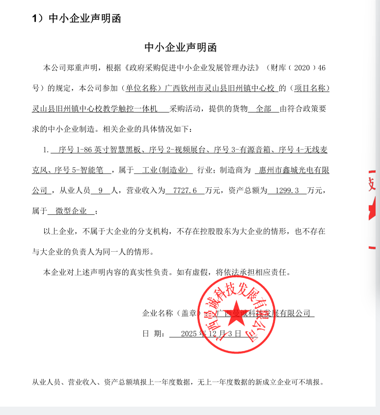 钦州市政府采购中心关于灵山县旧州镇中心校教学触控一体机(QZZC2025-J1-210279-QZSZ)成交公告