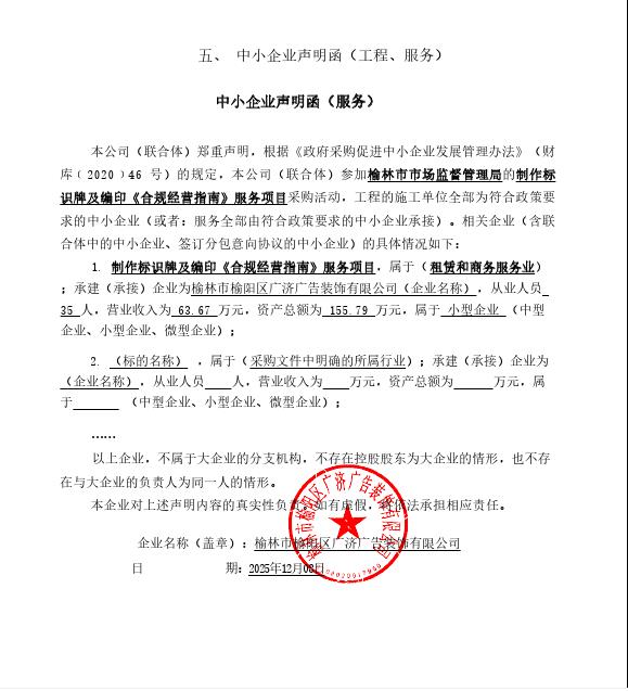 榆林市市场监督管理局制作标识牌及编印《合规经营指南》服务项目中标(成交)结果公告