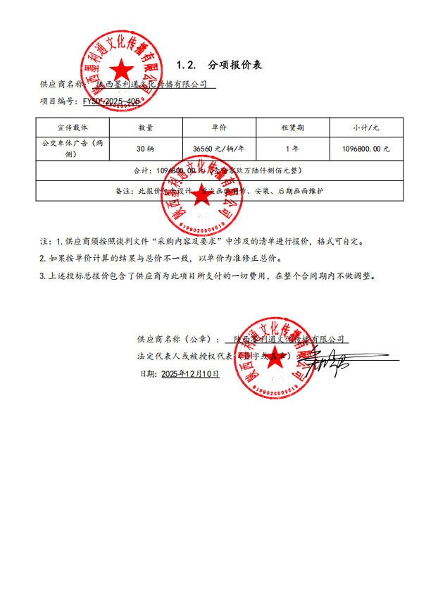 一、项目编号:FYSD-2025-405 二、项目名称:2026年公交车体广告服务项目 三、采购结果 采购包1: | 供应商名称 | 供应商地址 | 中标(成交)金额 | 评审价格 | | 陕西墨利通文化传播有限公司 | 陕西省西咸新区空港新城空港国际商务中心E区6层10602-L号房M0039【集群】 | 1,079,880.00元 | 1,079,880.00元 | 四、主要标的信息 合同包1(榆林市福利彩票发行中心2026年公交车体广告服务项目): 服务类(陕西墨利通文化传播有限公司) | 品目号 | 品目名称 | 采购标的 | 服务范围 | 服务要求 | 服务时间 | 服务标准 | 金额(元) | | 1 | 广告宣传服务 | 公交车体广告服务 | 详见采购文件 | 详见采购文件 | 一年 | 符合国家验收合格标准 | 1,079,880.00 | 五、评审专家(单一来源采购人员)名单: 六、代理服务收费标准及金额: | 代理服务收费标准及金额 | 招标代理服务费收取参照国家计委颁布的《招标代理服务收费管理暂行办法》(计价格[2002]1980号)和(发改办价格[2003]857号)收费标准收取。 | | 合同包号 | 合同包名称 | 代理服务费金额(万元) | 收取对象 | | 1 | 榆林市福利彩票发行中心2026年公交车体广告服务项目 | 1.5639 | 中标(成交)供应商 | 七、公告期限 自本公告发布之日起1个工作日。 八、其他补充事宜 九、凡对本次公告内容提出询问,请按以下方式联系。 1.采购人信息 名称:榆林市福利彩票发行中心 地址:榆林市青山西路榆林市民政局办公楼 联系方式:15891251690 2.采购代理机构信息 名称:陕西沣银时代项目管理有限公司 地址:榆林市西港锦天城B4-2-401 联系方式:17309129605 3.项目联系方式 项目联系人:司愿 电话:17309129605 陕西沣银时代项目管理有限公司 2025年12月11日 |