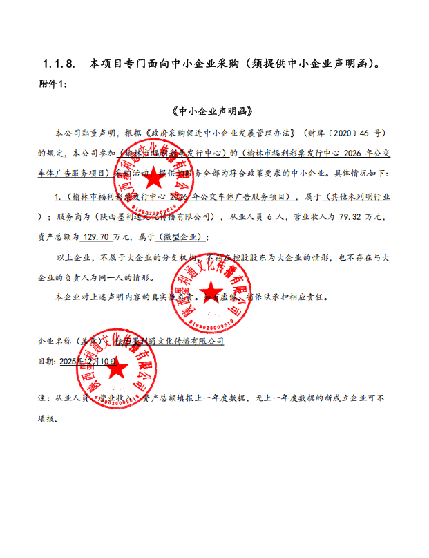 公告概要:| 公告信息: | | 采购项目名称 | 2026年公交车体广告服务项目 | | 品目 | | | 采购单位 | 榆林市福利彩票发行中心 | | 行政区域 | 榆林市 | 公告时间 | 2025年12月11日 08:44 | | 评审专家(单一来源采购人员)名单 | 曹雨生,张芳,赵丽 | | 总成交金额 | ¥107.988000 万元(人民币) | | 联系人及联系方式: | | 项目联系人 | 司愿 | | 项目联系电话 | 17309129605 | | 采购单位 | 榆林市福利彩票发行中心 | | 采购单位地址 | 榆林市青山西路榆林市民政局办公楼 | | 采购单位联系方式 | 15891251690 | | 代理机构名称 | 陕西沣银时代项目管理有限公司 | | 代理机构地址 | 榆林市西港锦天城B4-2-401 | | 代理机构联系方式 | 17309129605 | | 附件: | | 附件1 | 榆林市福利彩票发行中心2026年公交车体广告服务项目中标(成交)明细.pdf | | 附件2 | 招标文件正文.pdf | | 附件3 | 分项报价表.png | | 附件4 | 中小企业声明函.png |