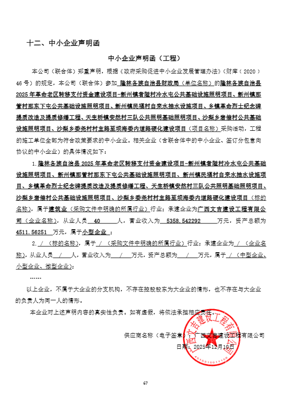 一、项目编号:BSZC2025-C2-310143-GXXD 二、项目名称:隆林各族自治县2025年革命老区转移支付资金建设项目-新州镇者隘村冷水屯公共基础设施照明项目、新州镇那管村那东下屯公共基础设施照明项目、新州镇民福村自来水抽水设施项目、乡镇革命烈士纪念碑提质改造及提质修缮工程、天生桥镇安然村三队公共照明基础照明项目、沙梨乡岩偿村公共基础设施照明项目、沙梨乡委尧村村主路至坝海委内道路硬化建设项目 三、中标(成交)信息 1.中标结果: | 序号 | 中标(成交)金额(元) | 中标供应商名称 | 中标供应商地址 | | 1 | 报价:2223562.36(元) | 广西文吉建设工程有限公司 | 隆林各族自治县新州镇迎宾大道717号(步行街5号楼7栋1层106号) |