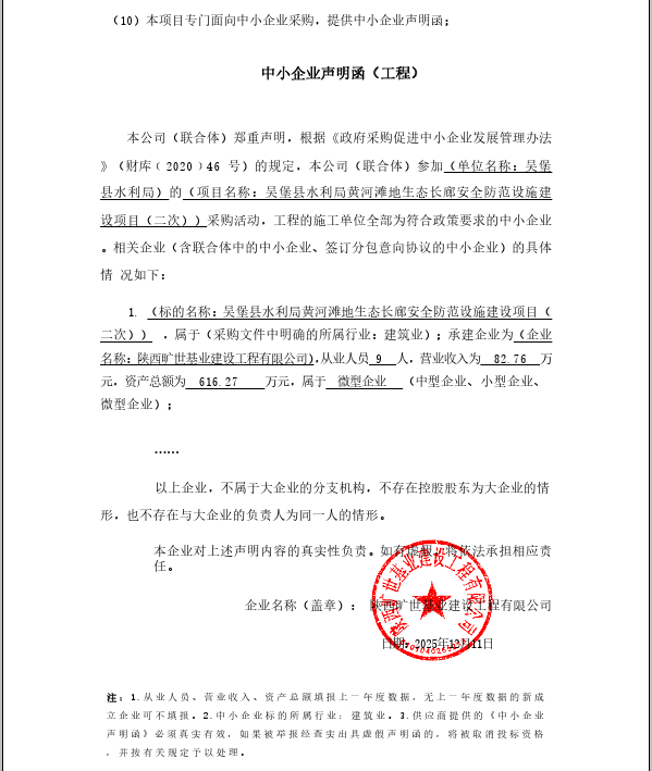 公告概要:| 公告信息: | | 采购项目名称 | 黄河滩地生态长廊安全防范设施建设项目(二次) | | 品目 | | | 采购单位 | 吴堡县水利局 | | 行政区域 | 吴堡县 | 公告时间 | 2025年12月12日 10:33 | | 评审专家(单一来源采购人员)名单 | 王勤,马建军,张秋英 | | 总成交金额 | ¥182.468000 万元(人民币) | | 联系人及联系方式: | | 项目联系人 | 李卓 | | 项目联系电话 | 17749200027 | | 采购单位 | 吴堡县水利局 | | 采购单位地址 | 吴堡县宋家川镇水利坡21号 | | 采购单位联系方式 | 09126521178 | | 代理机构名称 | 陕西泓祥兴顺工程项目管理有限公司 | | 代理机构地址 | 陕西省榆林市高新技术产业园区蓝岛路与建业大道交叉北口北160米高新华府西门二层1号商铺 | | 代理机构联系方式 | 17749200027 | | 附件: | | 附件1 | 吴堡县水利局黄河滩地生态长廊安全防范设施建设项目(二次)中标(成交)明细.pdf | | 附件2 | 声明函.png |