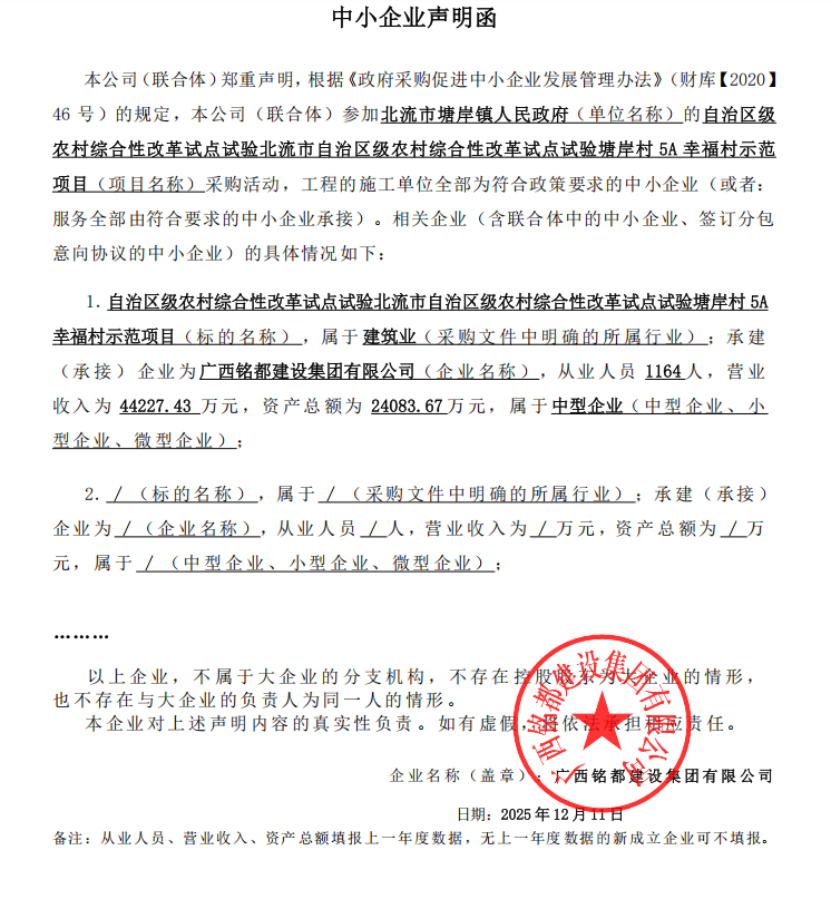 一、项目编号:YLZC2025-C2-810285-GXTH 二、项目名称:自治区级农村综合性改革试点试验北流市自治区级农村综合性改革试点试验塘岸村5A幸福村示范项目 三、中标(成交)信息 1.中标结果: | 序号 | 中标(成交)金额(元) | 中标供应商名称 | 中标供应商地址 | | 1 | 报价:1021886.91(元) | 广西铭都建设集团有限公司 | 北流市城北二路2号城市时代10层 |