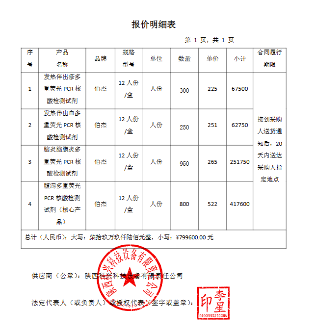 一、项目编号:ZCZX2025-CS-225 二、项目名称:传染病四大症候群多病原哨点监测试剂采购项目 三、采购结果 合同包1(西安市疾病预防控制中心传染病四大症候群多病原哨点监测试剂采购项目): | 供应商名称 | 供应商地址 | 评审方法 | 是否价格扣除 | 中标(成交)金额 | 评审总得分 | | 陕西科兴科技设备有限责任公司 | 陕西省西安市长安区郭杜街办双创中心3楼301室 | 综合评分法 | 否 | 799,600.00元 | 95.67 | 四、主要标的信息 合同包1(西安市疾病预防控制中心传染病四大症候群多病原哨点监测试剂采购项目): 货物类(陕西科兴科技设备有限责任公司) | 品目号 | 品目名称 | 采购标的 | 品牌 | 规格型号 | 数量(单位) | 单价(元) | 总价(元) | | 1-1 | 生物试剂盒 | 腹泻多重荧光腹泻多重荧光PCR核酸检测试剂等 | 伯杰 | 12人份/盒 | 1.00(批) | 799,600.00 | 799,600.00 | 五、评审专家(单一来源采购人员)名单: 六、代理服务收费标准及金额: | 代理服务收费标准及金额 | 参照国家计委关于印发《招标代理服务收费管理暂行办法》的通知(计价格〔2002〕1980号)、《国家发展和改革委员会办公厅关于招标代理服务收费有关问题的通知》(发改办价格〔2003〕857号)规定向中标(成交)供应商收取代理服务费。 成交单位的代理服务费交纳信息 银行户名:陕西众诚致信管理咨询有限公司 开户银行:北京银行股份有限公司西安分行营业部 账 号:20000042729000032633420 联系人:范道宏 联系电话:029-88565528 | | 合同包号 | 合同包名称 | 代理服务费金额(万元) | 收取对象 | | 1 | 西安市疾病预防控制中心传染病四大症候群多病原哨点监测试剂采购项目 | 1.1994 | 中标(成交)供应商 | 七、公告期限 自本公告发布之日起1个工作日。 八、其他补充事宜 九、凡对本次公告内容提出询问,请按以下方式联系。 1.采购人信息 名称:西安市疾病预防控制中心 地址:西安市西影路599号 联系方式:029-85535673 2.采购代理机构信息 名称:陕西众诚致信管理咨询有限公司 地址:西安曲江新区翠华南路1688号创意盒子13层1304室 联系方式:029-89565998 3.项目联系方式 项目联系人:王鹏飞、吴芳超、孟凌 电话:029-89565998 陕西众诚致信管理咨询有限公司 2025年12月15日 |