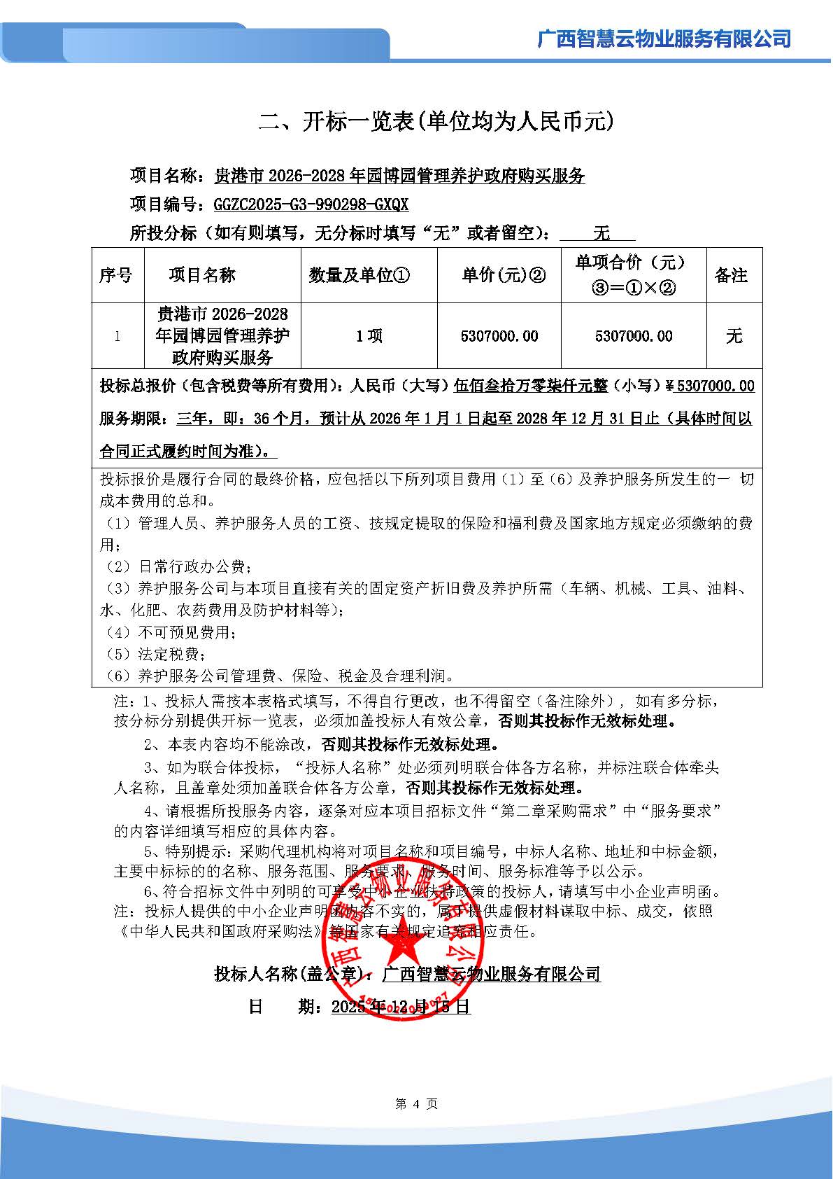 2.废标结果: 四、主要标的信息 服务类主要标的信息: | 序号 | 标项名称 | 标的名称 | 服务范围 | 服务要求 | 服务时间 | 服务标准 | | 1 | 贵港市2026-2028年园博园管理养护政府购买服务 | 贵港市 2026-2028 年园博园管理养护政府购买服务 | 详见招标文件第二章“采购需求” | 详见招标文件第二章“采购需求” | 三年,即:36 个月,预计从 2026 年 1 月 1 日起至 2028 年 12 月 31 日止(具体时间以 合同正式履约时间为准)。 | 详见招标文件第二章“采购需求” |