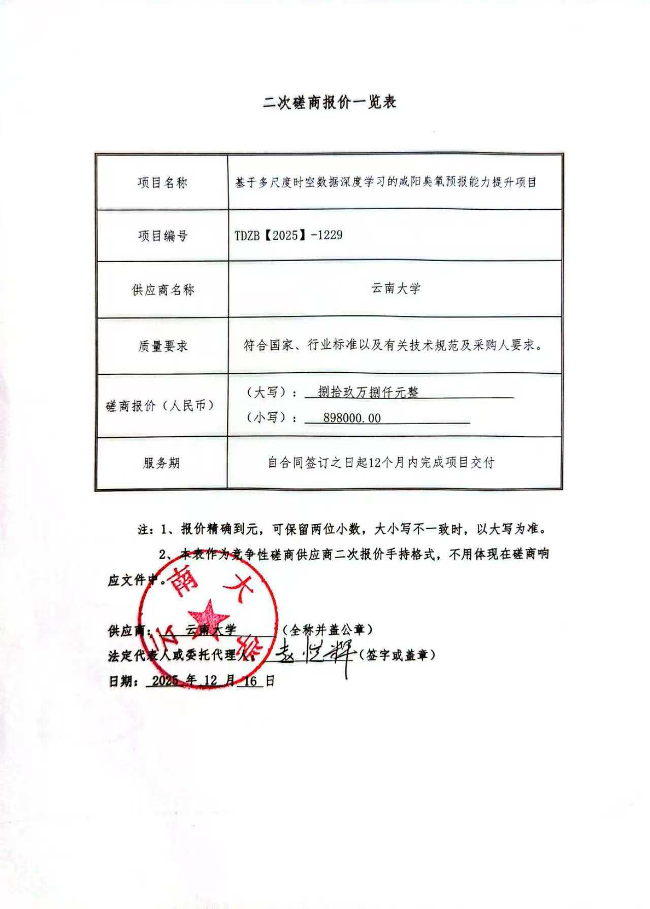一、项目编号:TDZB【2025】-1229 二、项目名称:基于多尺度时空数据深度学习的咸阳臭氧预报能力提升项目 三、采购结果 采购包1: | 供应商名称 | 供应商地址 | 中标(成交)金额 | 评审总得分 | | 云南大学 | 云南大学东陆校区 昆明市五华区翠湖北路2号/呈贡校区 昆明市星贡区大学城东外环南路 | 898,000.00元 | 83.83 | 四、主要标的信息 合同包1(基于多尺度时空数据深度学习的咸阳臭氧预报能力提升项目): 服务类(云南大学) | 品目号 | 品目名称 | 采购标的 | 服务范围 | 服务要求 | 服务时间 | 服务标准 | 金额(元) | | 1 | 其他生态环境保护服务 | 900000 | 详见磋商响应文件 | 达到国家现行技术标准及采购人要求 | 合同签订之日起12个月 | 详见磋商响应文件 | 898,000.00 | 五、评审专家(单一来源采购人员)名单: 六、代理服务收费标准及金额: | 代理服务收费标准及金额 | 按照国家计委(计价格【2002】1980号)《招标代理服务收费管理暂行办法》和国家发展和改革委员会办公厅颁发的《关于招标代理服务收费有关问题的通知》 (发改价格【2011】534号文件)有关规定执行。 | | 合同包号 | 合同包名称 | 代理服务费金额(万元) | 收取对象 | | 1 | 基于多尺度时空数据深度学习的咸阳臭氧预报能力提升项目 | 1.347 | 中标(成交)供应商 | 七、公告期限 自本公告发布之日起1个工作日。 八、其他补充事宜 九、凡对本次公告内容提出询问,请按以下方式联系。 1.采购人信息 名称:咸阳市环境监测站 地址:玉泉西路环保大厦 联系方式:029-32036584 2.采购代理机构信息 名称:陕西唐大项目管理咨询有限公司 地址:陕西省西安市沣东新城世纪大道白桦林印象4-2-1904 联系方式:18717282888 3.项目联系方式 项目联系人:张娣 电话:18717282888 陕西唐大项目管理咨询有限公司 2025年12月18日 |