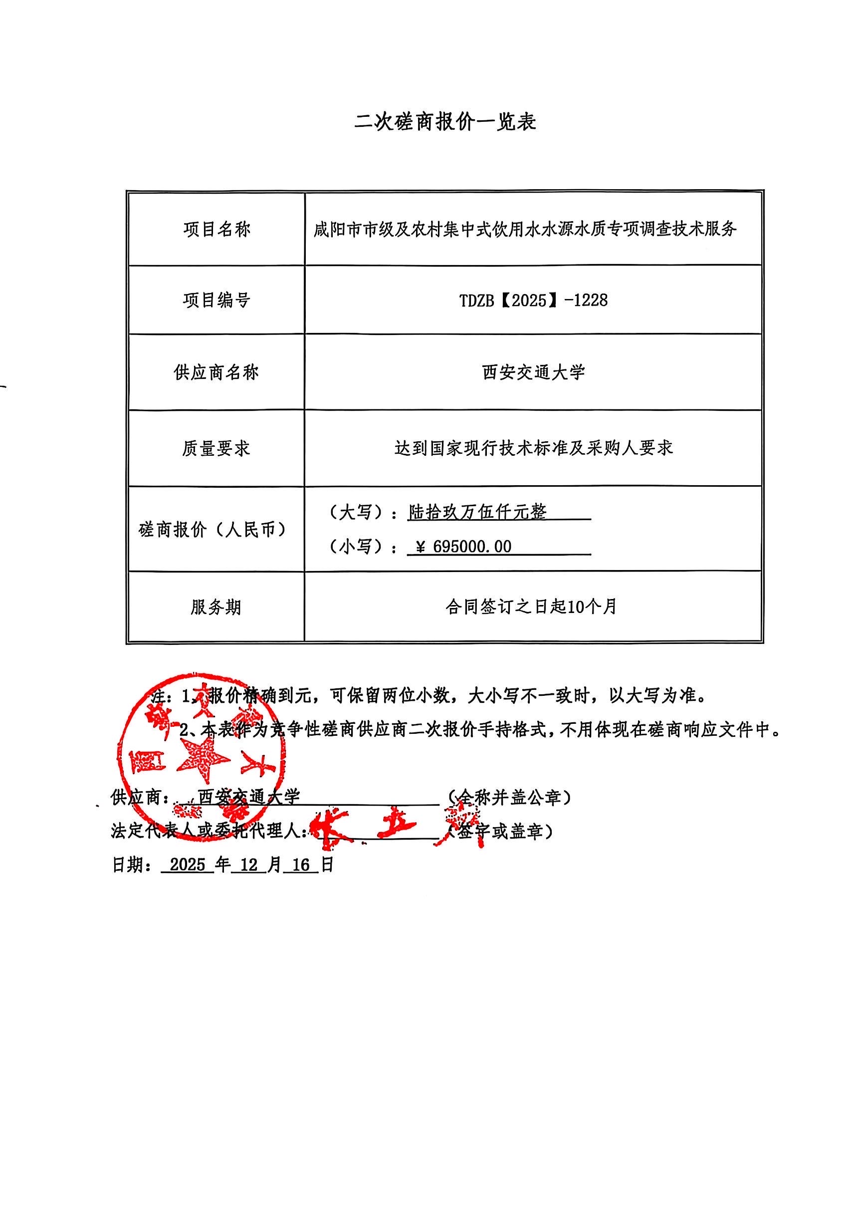 一、项目编号:TDZB【2025】-1228 二、项目名称:咸阳市市级及农村集中式饮用水水源水质专项调查技术服务项目 三、采购结果 采购包1: | 供应商名称 | 供应商地址 | 中标(成交)金额 | 评审总得分 | | 西安交通大学 | 陕西省西安市咸宁西路28号 | 695,000.00元 | 82.37 | 四、主要标的信息 合同包1(咸阳市市级及农村集中式饮用水水源水质专项调查技术服务项目): 服务类(西安交通大学) | 品目号 | 品目名称 | 采购标的 | 服务范围 | 服务要求 | 服务时间 | 服务标准 | 金额(元) | | 1 | 生态资源调查与监测服务 | 700000 | 详见磋商响应文件 | 达到国家现行技术标准及采购人要求 | 合同签订之日起10个月 | 详见磋商响应文件 | 695,000.00 | 五、评审专家(单一来源采购人员)名单: 六、代理服务收费标准及金额: | 代理服务收费标准及金额 | 按照国家计委(计价格【2002】1980号)《招标代理服务收费管理暂行办法》和国家发展和改革委员会办公厅颁发的《关于招标代理服务收费有关问题的通知》 (发改价格【2011】534号文件)有关规定执行。 | | 合同包号 | 合同包名称 | 代理服务费金额(万元) | 收取对象 | | 1 | 咸阳市市级及农村集中式饮用水水源水质专项调查技术服务项目 | 1.0425 | 中标(成交)供应商 | 七、公告期限 自本公告发布之日起1个工作日。 八、其他补充事宜 九、凡对本次公告内容提出询问,请按以下方式联系。 1.采购人信息 名称:咸阳市环境监测站 地址:玉泉西路环保大厦 联系方式:029-32036584 2.采购代理机构信息 名称:陕西唐大项目管理咨询有限公司 地址:陕西省西安市沣东新城世纪大道白桦林印象4-2-1904 联系方式:18717282888 3.项目联系方式 项目联系人:张娣 电话:18717282888 陕西唐大项目管理咨询有限公司 2025年12月18日 |