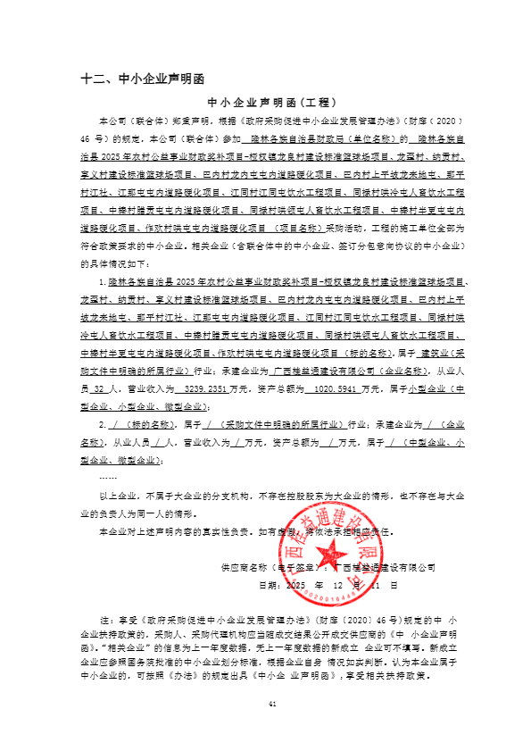 2.废标结果: 四、主要标的信息 工程类主要标的信息: | 序号 | 标项名称 | 标的名称 | 施工范围 | 施工工期 | 项目经理 | 执业证书信息 | | 1 | 隆林各族自治县2025年农村公益事业财政奖补项目-桠杈镇龙良村建设标准篮球场项目、龙歪村、纳贡村、享义村建设标准篮球场项目、巴内村龙内屯屯内道路硬化项目、巴内村上平坡龙来地屯、那平村江社、江那屯屯内道路硬化项目、江同村江同屯饮水工程项目、同禄村哄冷屯人畜饮水工程项目、中棒村腊贡屯屯内道路硬化项目、同禄村哄领屯人畜饮水工程项目、中棒村半更屯屯内道路硬化项目、作欢村哄屯屯内道路硬化项目 | 隆林各族自治县2025年农村公益事业财政奖补项目-桠杈镇龙良村建设标准篮球场项目、龙歪村、纳贡村、享义村建设标准篮球场项目、巴内村龙内屯屯内道路硬化项目、巴内村上平坡龙来地屯、那平村江社、江那屯屯内道路硬化项目、江同村江同屯饮水工程项目、同禄村哄冷屯人畜饮水工程项目、中棒村腊贡屯屯内道路硬化项目、同禄村哄领屯人畜饮水工程项目、中棒村半更屯屯内道路硬化项目、作欢村哄屯屯内道路硬化项目 | 施工图纸包括的所有工程(详见施工图纸及工程量清单) | 90日历天 | 黎军 | 桂245101014282 | 五、评审专家(单一来源采购人员)名单: 李涵(第1分标采购人代表),黎林清,石应芳 六、代理服务收费标准及金额: 1.代理服务收费标准:根据国家发改委计价格[2002]1980号文件及桂价费字[2011]55号文件规定收取。 2.代理服务收费金额(元):21750 七、公告期限 自本公告发布之日起1个工作日。 八、其他补充事宜 无 九、对本次公告内容提出询问,请按以下方式联系 1.采购人信息 名 称:隆林各族自治县财政局 地 址:隆林各族自治县新州镇迎宾路721号 联系方式:0776-8202653 2.采购代理机构信息 名 称:广西双翔工程管理咨询有限公司 地 址:广西百色市右江区长乐星城1栋 联系方式:0776-2770399 3.项目联系方式 项目联系人:刘小玲 电 话:0776-2770399 附件信息: |