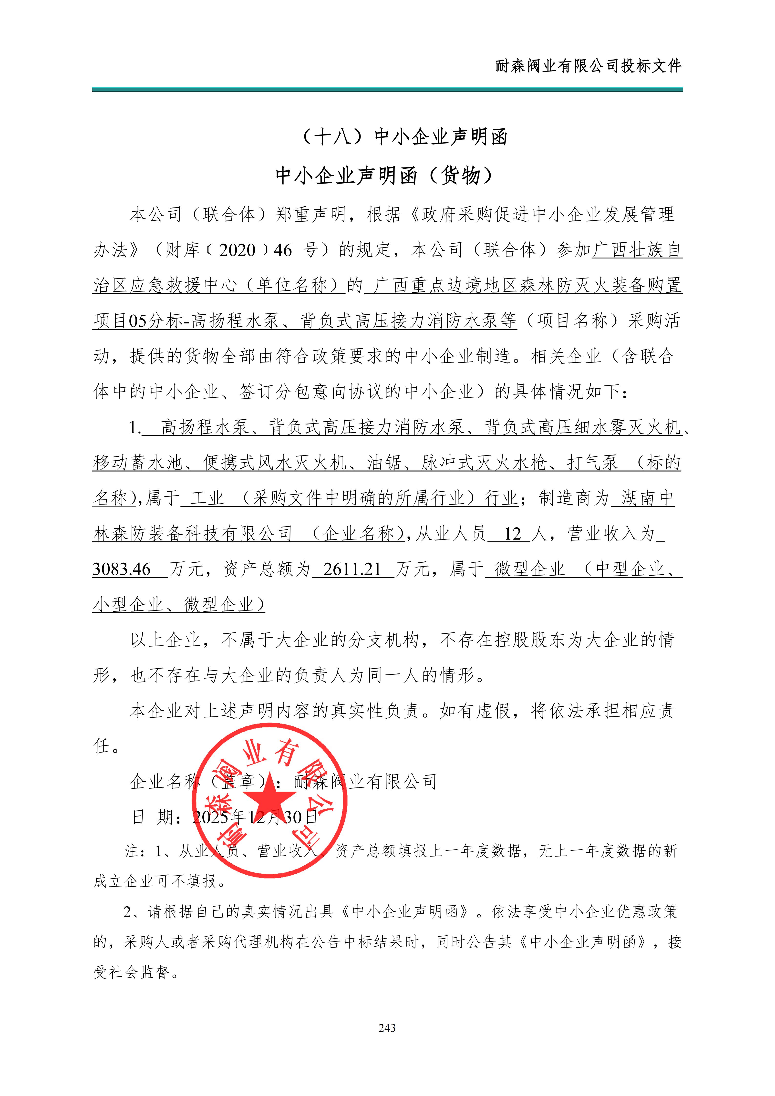 一、项目编号:GXZC2025-G1-003677-GLZB 二、项目名称:广西重点边境地区森林防灭火装备购置项目05分标-高扬程水泵、背负式高压接力消防水泵等 三、中标(成交)信息 1.中标结果: | 序号 | 中标(成交)金额(元) | 中标供应商名称 | 中标供应商地址 | | 1 | 报价:8782800(元) | 耐森阀业有限公司 | 浙江省温州市永嘉县乌牛街道岭下村(海星海事电气集团有限公司内) |