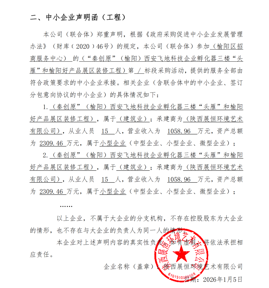 四、主要标的信息合同包1(“秦创原”(榆阳)西安飞地科技企业孵化器三楼“头雁”和榆阳好产品展区装修工程): 工程类(陕西展恒环境艺术有限公司)
