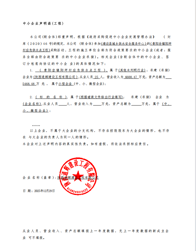 公告概要:| 公告信息: | | 采购项目名称 | 青阳岔镇阳坪村应急供水点工程 | | 品目 | | | 采购单位 | 靖边县城乡供水安全服务中心 | | 行政区域 | 靖边县 | 公告时间 | 2026年01月14日 15:22 | | 评审专家(单一来源采购人员)名单 | 罗毅,苏晓波,贺琬婷 | | 总成交金额 | ¥67.520000 万元(人民币) | | 联系人及联系方式: | | 项目联系人 | 李工 | | 项目联系电话 | 13571820281 | | 采购单位 | 靖边县城乡供水安全服务中心 | | 采购单位地址 | 靖边县党政第二办公区 | | 采购单位联系方式 | 15929220765 | | 代理机构名称 | 华辰英迈(陕西)项目管理有限公司 | | 代理机构地址 | 陕西省西安市莲湖区陕西省西安市莲湖区杏园路汉湖天璟1幢3单元804室 | | 代理机构联系方式 | 13571820281 | | 附件: | | 附件1 | 靖边县城乡供水安全服务中心青阳岔镇阳坪村应急供水点工程中标(成交)明细.pdf | | 附件2 | 中小企业声明.png |