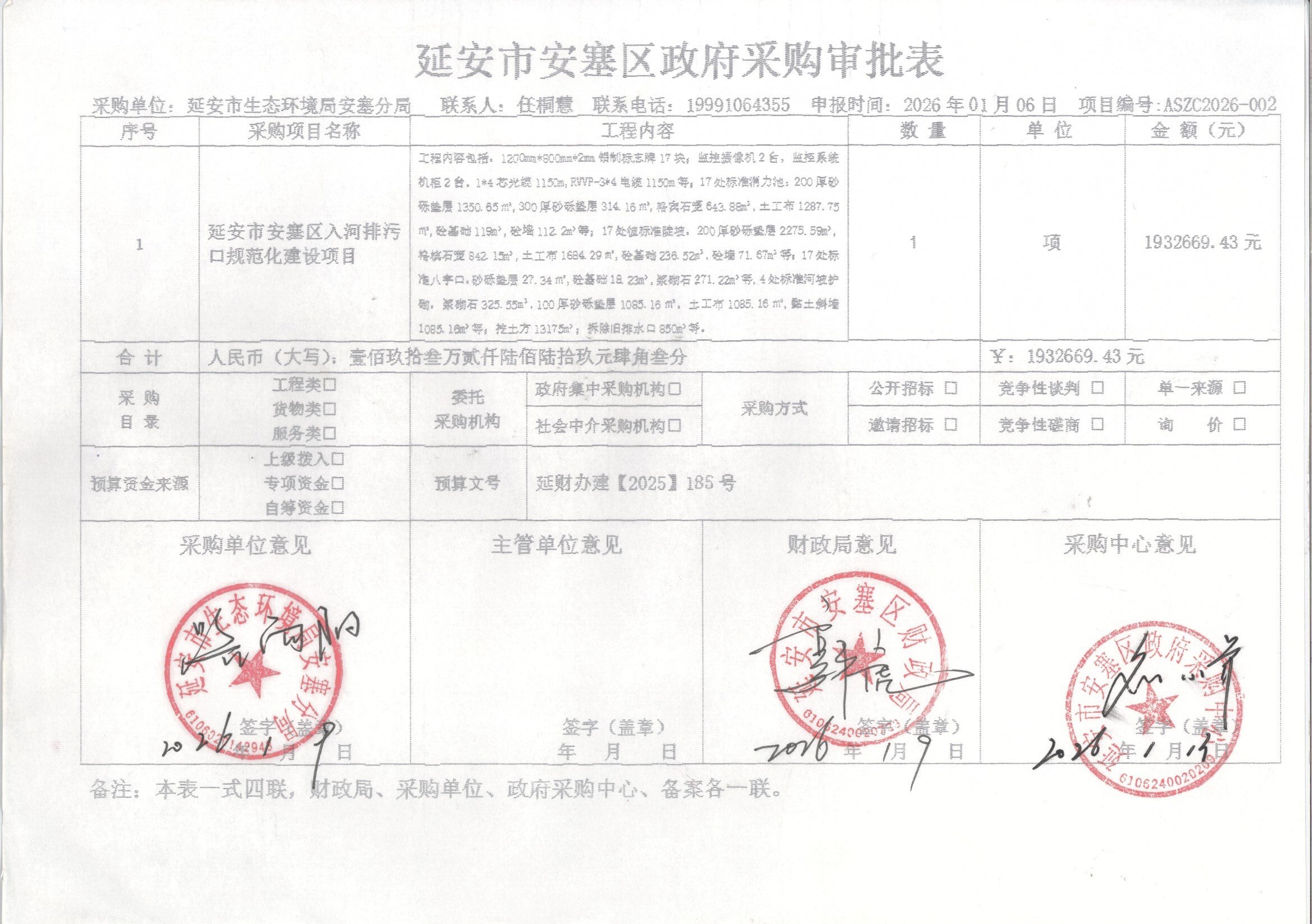 公告概要:| 公告信息: | | 采购项目名称 | 延安市安塞区入河排污口规范化建设项目 | | 品目 | | | 采购单位 | 延安市生态环境局安塞分局 | | 行政区域 | 安塞县 | 公告时间 | 2026年01月19日 22:47 | | 获取采购文件时间 | 2026年01月20日至2026年01月26日 每日上午:09:00 至 12:00 下午:14:00 至 18:00(北京时间,法定节假日除外) | | 响应文件递交地点 | 陕西省延安市宝塔区枣园路枣园大道7号商业楼三楼 | | 响应文件开启时间 | 2026年01月30日 14:00 | | 响应文件开启地点 | 陕西省延安市宝塔区枣园路枣园大道7号商业楼三楼 | | 预算金额 | ¥193.266943万元(人民币) | | 联系人及联系方式: | | 项目联系人 | 高续娥 | | 项目联系电话 | 13359286419 | | 采购单位 | 延安市生态环境局安塞分局 | | 采购单位地址 | 安塞区城南环保大楼 | | 采购单位联系方式 | 19991064355 | | 代理机构名称 | 陕西国慧智联项目管理有限公司 | | 代理机构地址 | 陕西省延安市宝塔区枣园路枣园大道7号商业楼三楼 | | 代理机构联系方式 | 13359286419 | | 附件: | | 附件1 | 采购审批表.jpeg |