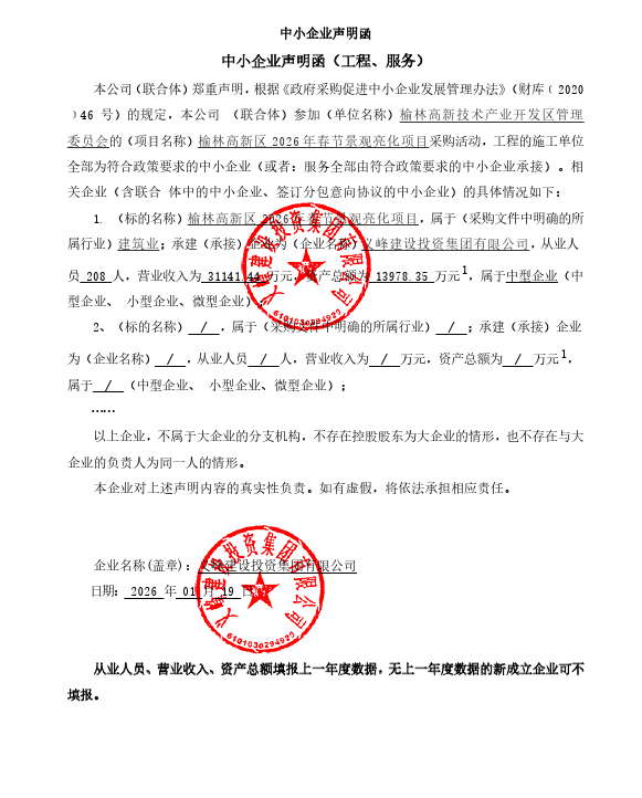 公告概要:| 公告信息: | | 采购项目名称 | 榆林高新区2026年春节景观亮化项目 | | 品目 | | | 采购单位 | 榆林高新技术产业开发区管理委员会 | | 行政区域 | 榆横工业园区 | 公告时间 | 2026年01月20日 09:26 | | 评审专家(单一来源采购人员)名单 | 魏效芬,刘磊,许占斌 | | 总成交金额 | ¥223.590000 万元(人民币) | | 联系人及联系方式: | | 项目联系人 | 榆林龙宸瑞安工程项目管理有限公司 | | 项目联系电话 | 19191298978 | | 采购单位 | 榆林高新技术产业开发区管理委员会 | | 采购单位地址 | 陕西省榆林市高新技术产业开发区创业大厦 | | 采购单位联系方式 | 13209127756 | | 代理机构名称 | 榆林龙宸瑞安工程项目管理有限公司 | | 代理机构地址 | 陕西省榆林市榆阳区航宇路石化局小区2单元301 | | 代理机构联系方式 | 19191298978 | | 附件: | | 附件1 | 榆林高新技术产业开发区管理委员会榆林高新区2026年春节景观亮化项目中标(成交)明细.pdf | | 附件2 | 中小企业声明函.png |