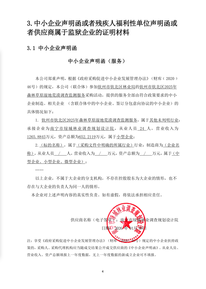 2.废标结果: 四、主要标的信息 服务类主要标的信息: | 序号 | 标项名称 | 标的名称 | 服务范围 | 服务要求 | 服务时间 | 服务标准 | | 1 | 钦州市钦北区2025年森林草原湿地荒漠调查监测服务 | 钦州市钦北区2025年森林草原湿地荒漠调查监测服务 | 详见竞争性磋商文件“第三章 项目采购需求”。 | 详见竞争性磋商文件“第三章 项目采购需求”。 | 签订合同后 30 日内服务成果经相关林业主管部门审核验收并交付使用,如相关林业主管部门要求提交成果时间有变动,以最终时间为准。 | 成果材料符合《广西壮族自治区林业局关于做好2025年度全国国土变更调查及森林草原湿地荒漠调查监测工作的通知》 (自然资办〔2025〕33号)文件的相关要求,并通过自治区林业局审查。 |