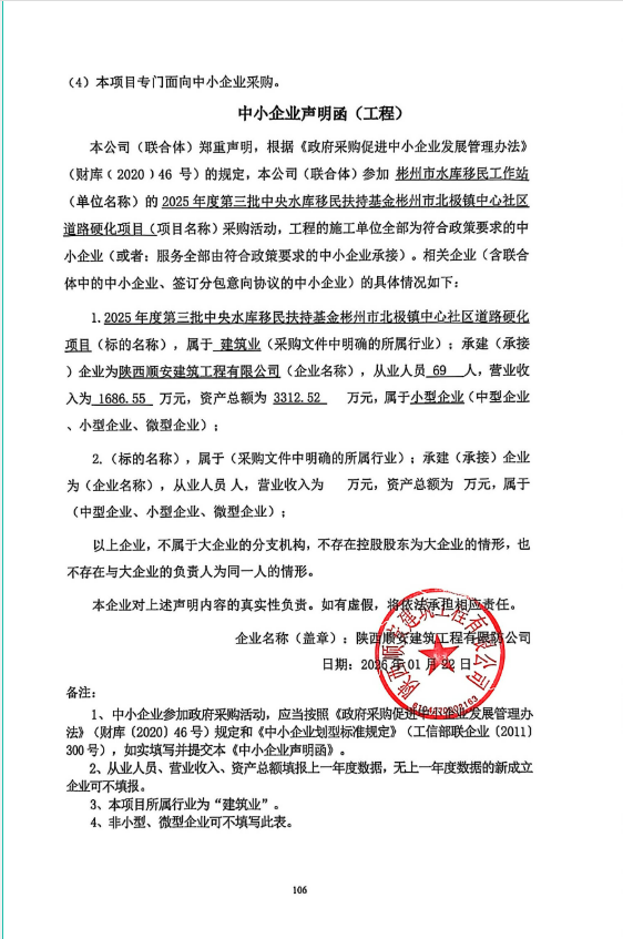 彬州市水利局2025年度第三批中央水库移民扶持基金彬州市北极镇中心社区道路硬化项目中标(成交)结果公告