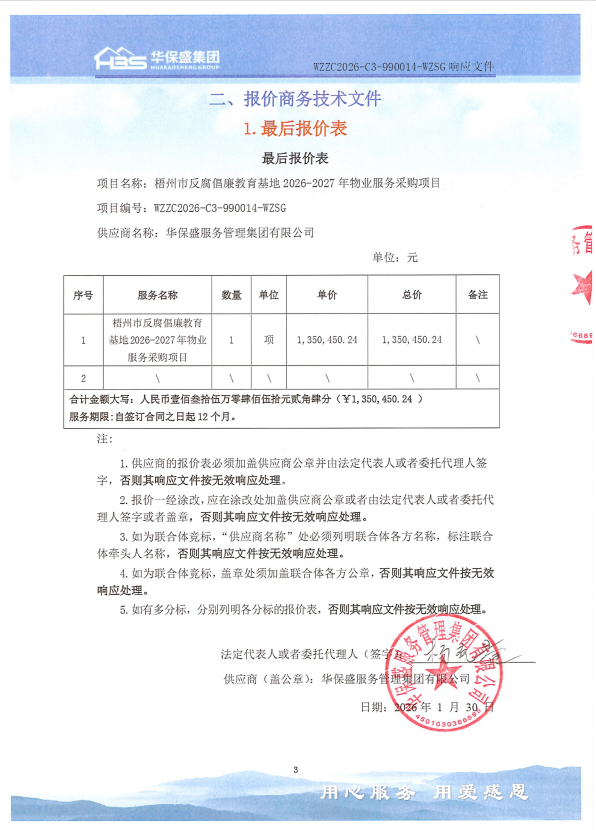 一、项目编号:WZZC2026-C3-990014-WZSG 二、项目名称:梧州市反腐倡廉教育基地2026-2027年物业服务采购项目 三、中标(成交)信息 1.中标结果: | 序号 | 中标(成交)金额(元) | 中标供应商名称 | 中标供应商地址 | | 1 | 报价:1350450.24(元) | 华保盛服务管理集团有限公司 | 中国(广西)自由贸易试验区南宁片区平乐大道15号五象绿地中心1号楼十一层1118 号办公“一照多址企业” |