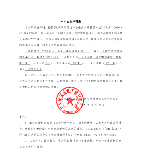 四、主要标的信息合同包1(2026年大王街道公厕保洁服务项目): 服务类(西安唯硕建筑工程有限公司)