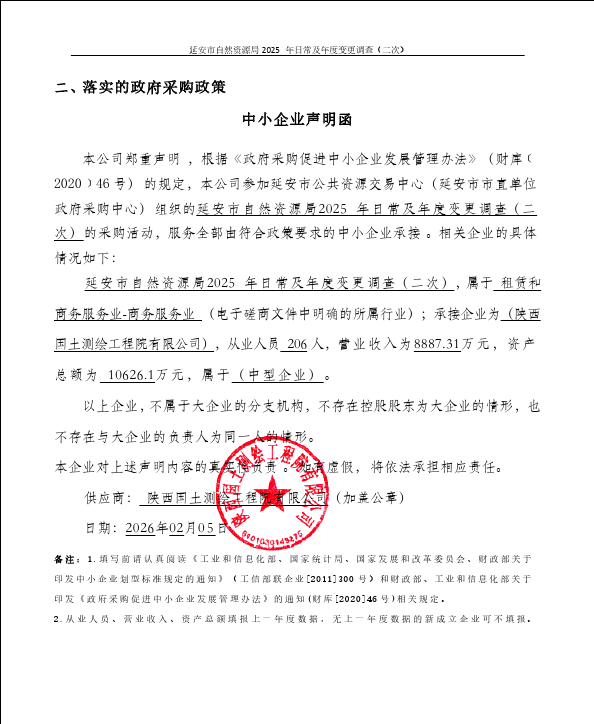 公告概要:| 公告信息: | | 采购项目名称 | 2025年日常及年度变更调查项目(二次) | | 品目 | | | 采购单位 | 延安市自然资源局 | | 行政区域 | 延安市 | 公告时间 | 2026年02月06日 10:25 | | 评审专家(单一来源采购人员)名单 | 史小惠,王静,张玮 | | 总成交金额 | ¥195.960000 万元(人民币) | | 联系人及联系方式: | | 项目联系人 | 高女士 | | 项目联系电话 | 09112162221 | | 采购单位 | 延安市自然资源局 | | 采购单位地址 | 为民服务中心综合楼401 | | 采购单位联系方式 | 7090406 | | 代理机构名称 | 延安市市直单位政府采购中心 | | 代理机构地址 | 陕西省延安市宝塔区延安市新区为民服务中心南区东楼(7号楼)A2楼 | | 代理机构联系方式 | 09117092224 | | 附件: | | 附件1 | 延安市自然资源局2025年日常及年度变更调查项目(二次)中标(成交)明细.pdf | | 附件2 | 中小企业声明函.png |
