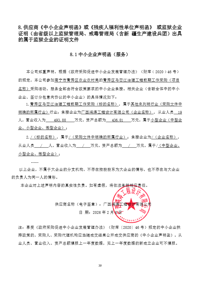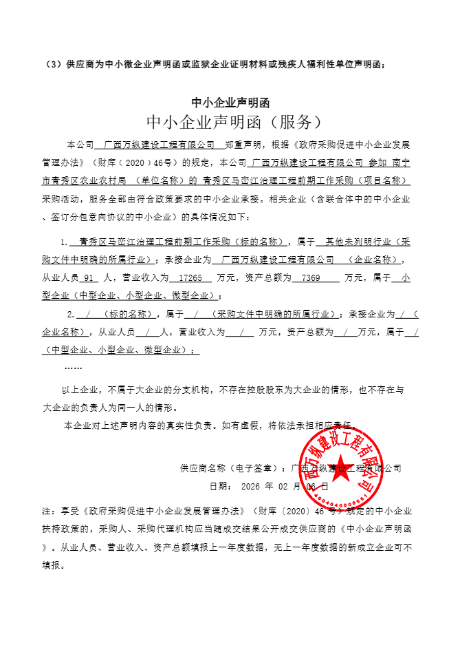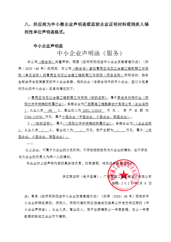 公告概要:| 公告信息: | | 采购项目名称 | 青秀区马峦江治理工程前期工作采购 | | 品目 | | | 采购单位 | 南宁市青秀区农业农村局 | | 行政区域 | 广西壮族自治区 | 公告时间 | 2026年02月10日 13:36 | | 评审专家(单一来源采购人员)名单 | 吴迪,罗鹏程,宋智静(第1分标采购人代表) | | 总成交金额 | ¥0.000000 万元(人民币) | | 联系人及联系方式: | | 项目联系人 | 邓云芳 | | 项目联系电话 | 0771-3821811 | | 采购单位 | 南宁市青秀区农业农村局 | | 采购单位地址 | 南宁市青秀区东葛路68号青秀大厦 | | 采购单位联系方式 | 0771-5566083 | | 代理机构名称 | 广西中之策工程咨询集团有限公司 | | 代理机构地址 | 南宁市青秀区葛村路18号新办公楼4楼401-408号房 | | 代理机构联系方式 | 0771-3821811 |