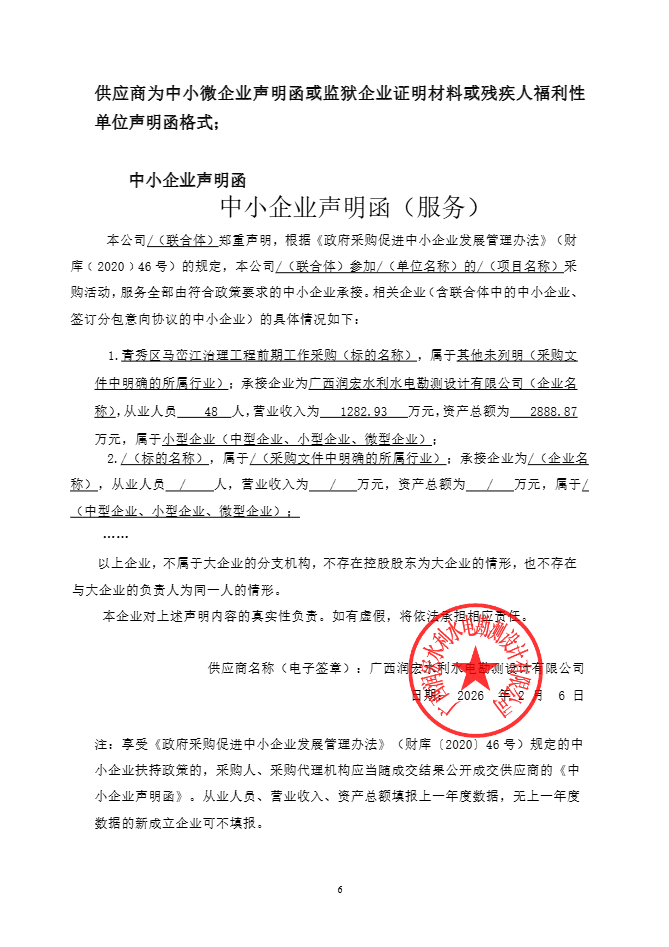 一、项目编号:NNZC2026-C3-030015-ZZCJ 二、项目名称:青秀区马峦江治理工程前期工作采购 三、中标(成交)信息 1.中标结果: | 序号 | 中标(成交)金额(元) | 中标供应商名称 | 中标供应商地址 | | 1 | 报价:99.6(%) | 广西聚海工程勘察设计有限公司 | 广西壮族自治区南宁市西乡塘区鲁班路95号南宁禾田信息港4号楼21层01号房 |