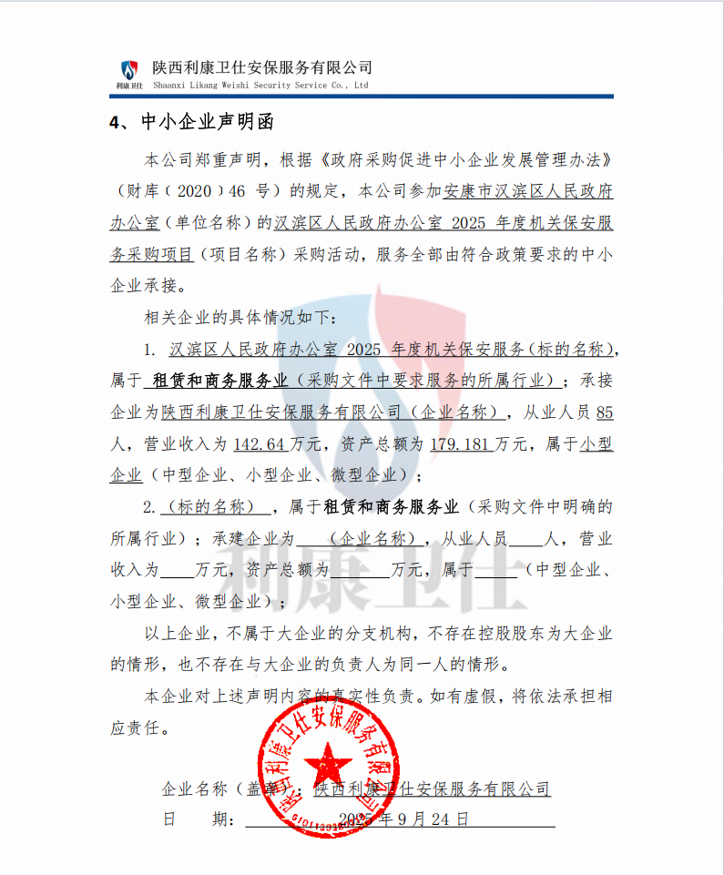 汉滨区人民政府办公室2025年度机关保安服务中标(成交)结果公告