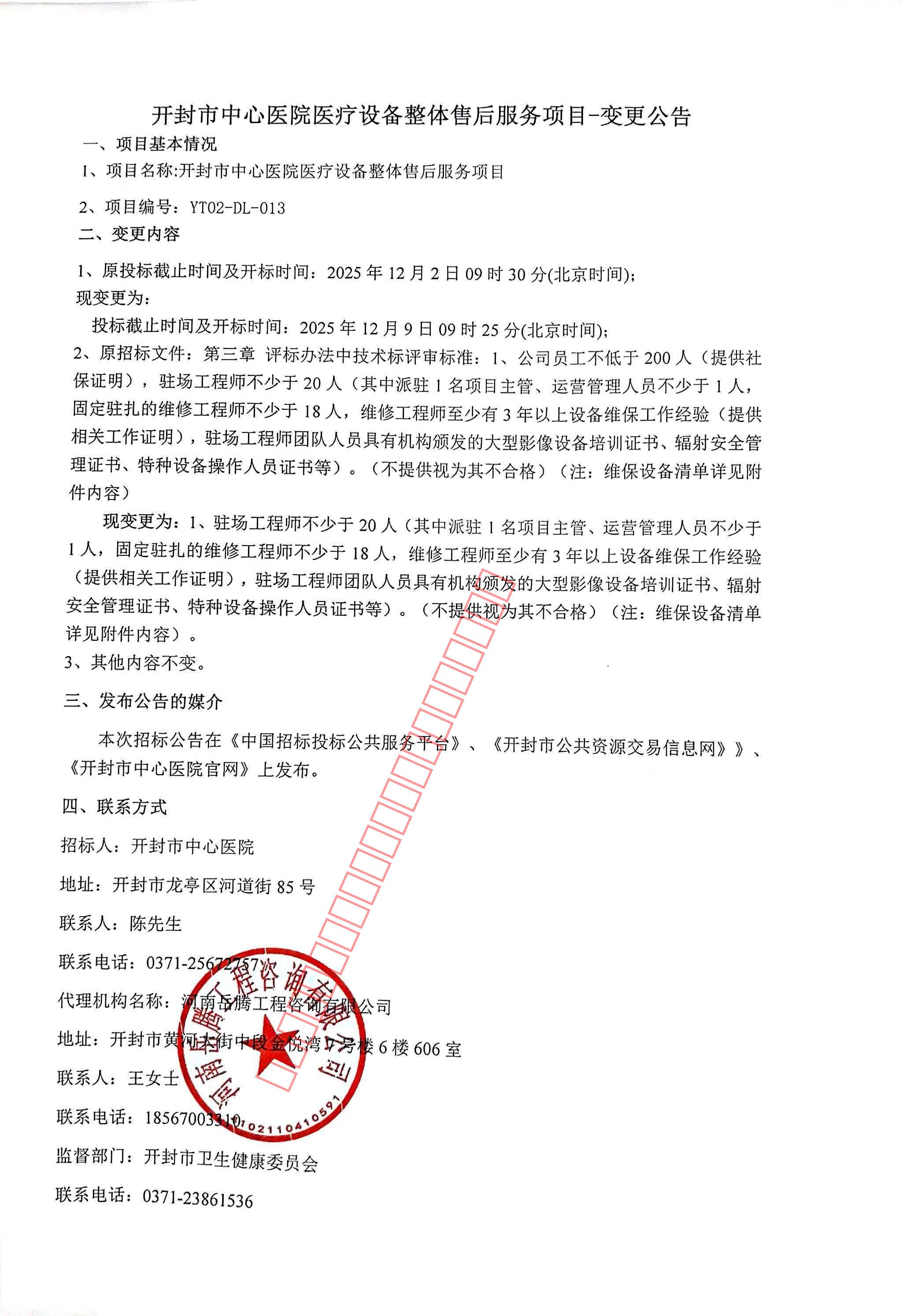 1 、项目名称 : 开封市中心医院医疗设备整体售后服务项目